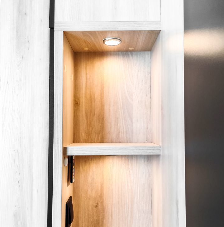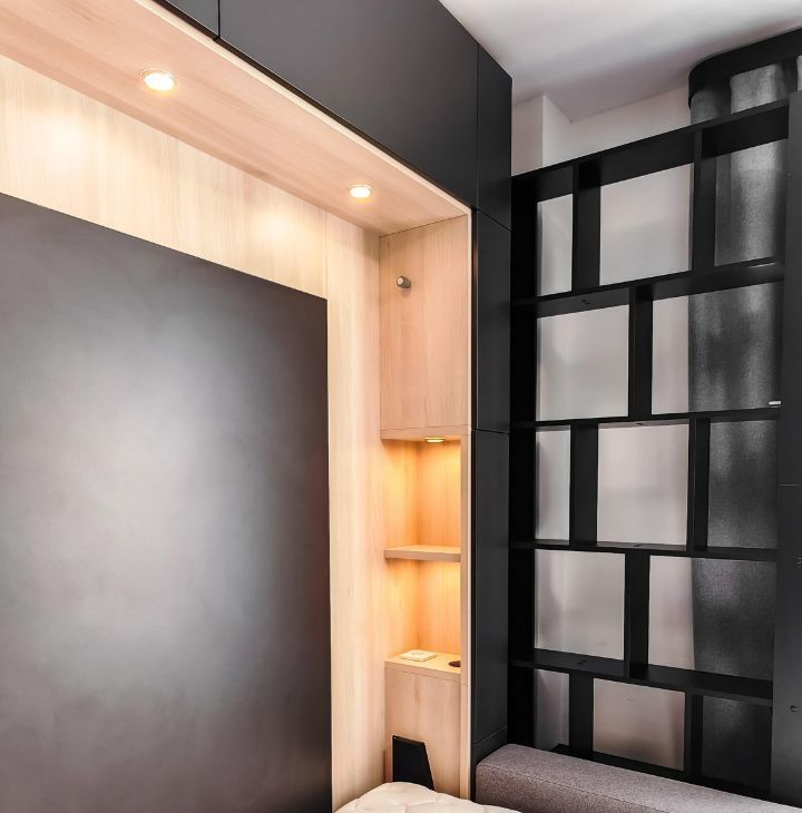 В квартире много осветительных приборов и световых зон: можно настроить освещение под любое настроение и задачу — от яркого рабочего света до тёплой уютной атмосферы.
