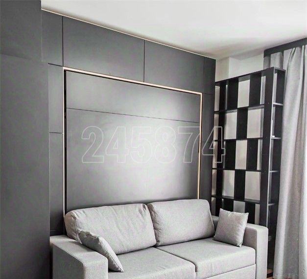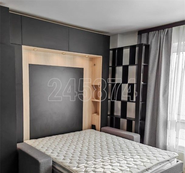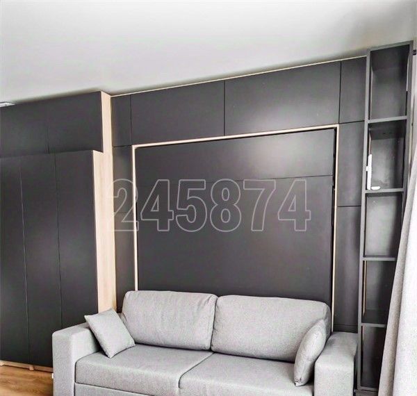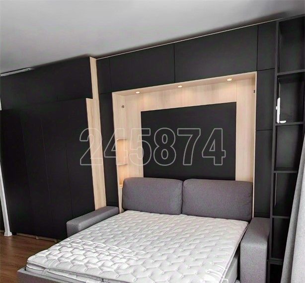 В студии установлен шкаф-кровать с диваном, на кровати отличный новый матрас Аскона средней жесткости с наматрасником делающийм его более мягким. Есть зона для проектора. Стол (шириной 100 см) раскладывается до 120 см.
