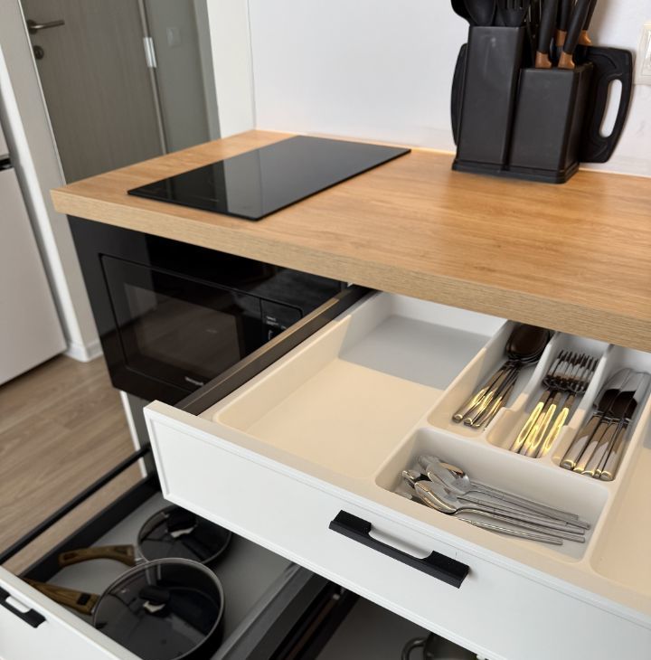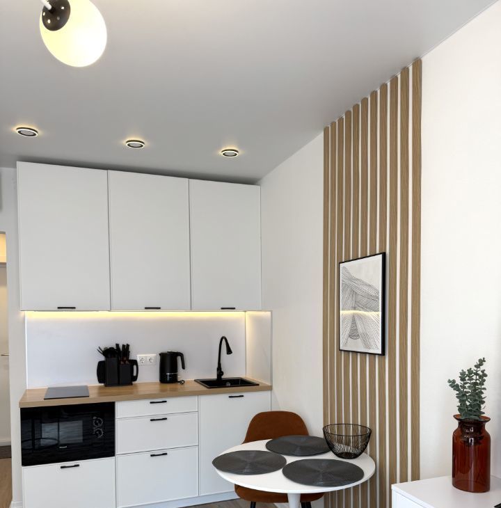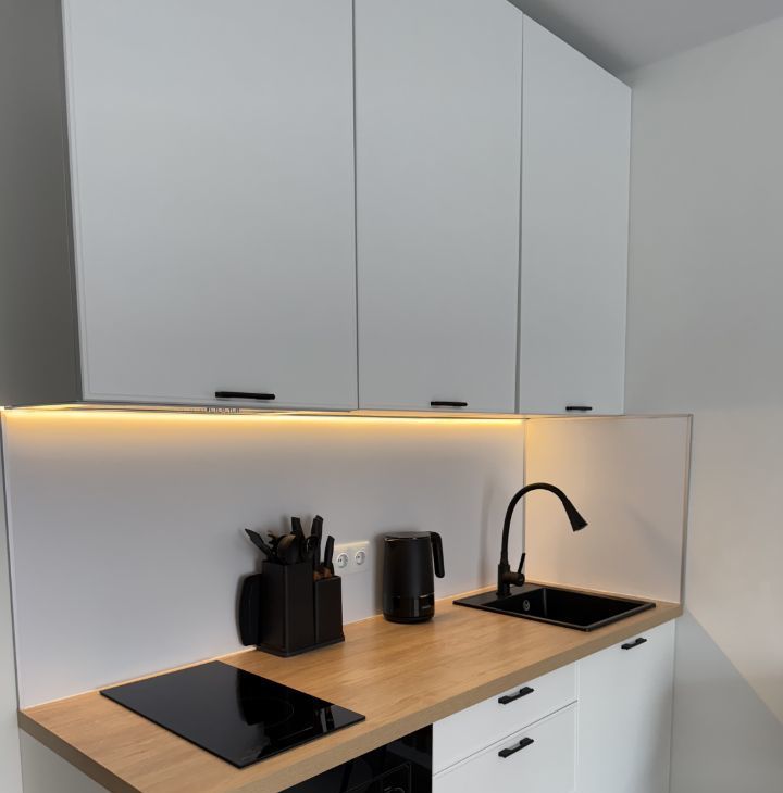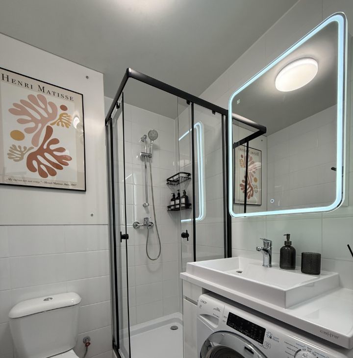 Бытовая техника: стиральная машина с функцией сушки, холодильник, варочная панель, телевизор smart, электрический чайник, кондиционер, утюг, микроволновая печь, вытяжка