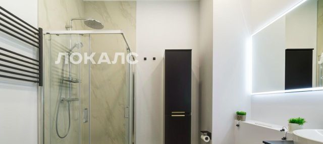 В ванной душевой уголок с фурнитурой Grohe, зеркало с подсветкой во всю стену, вместительный пенал с бельевой корзиной.