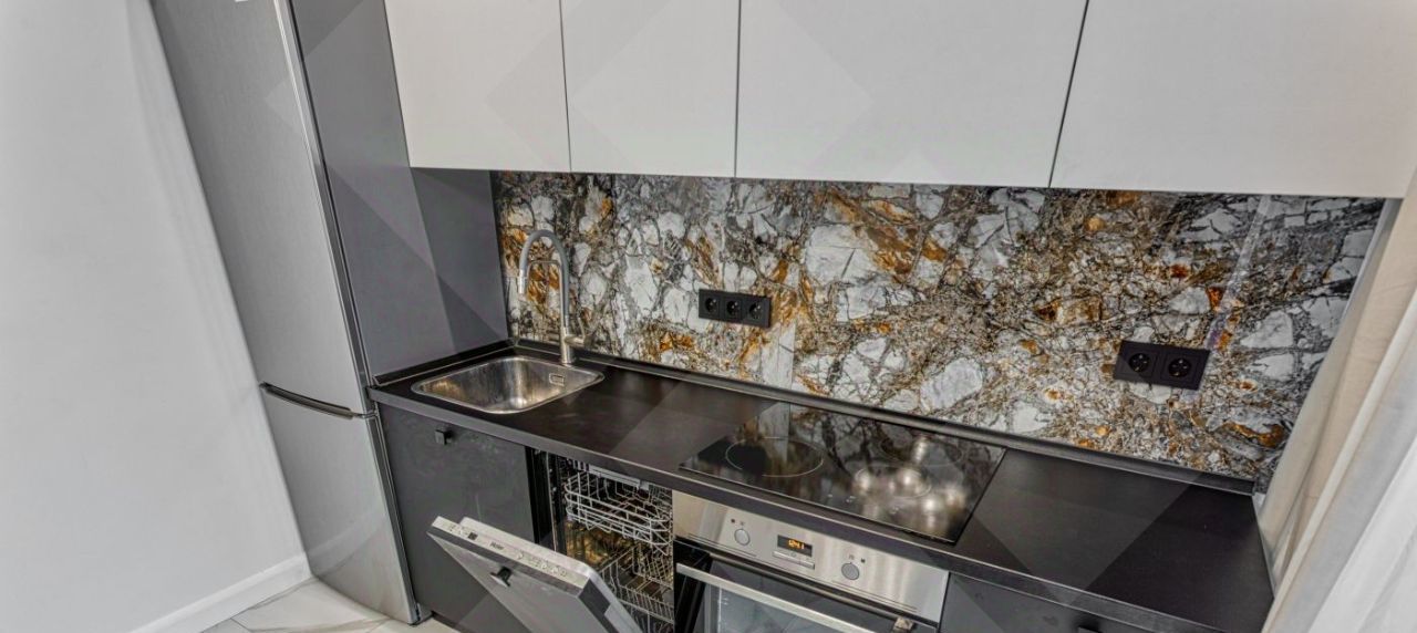 Есть посудомоечная машина, варочная панель, духовой шкаф, стиральная машина, холодильник и телевизор.