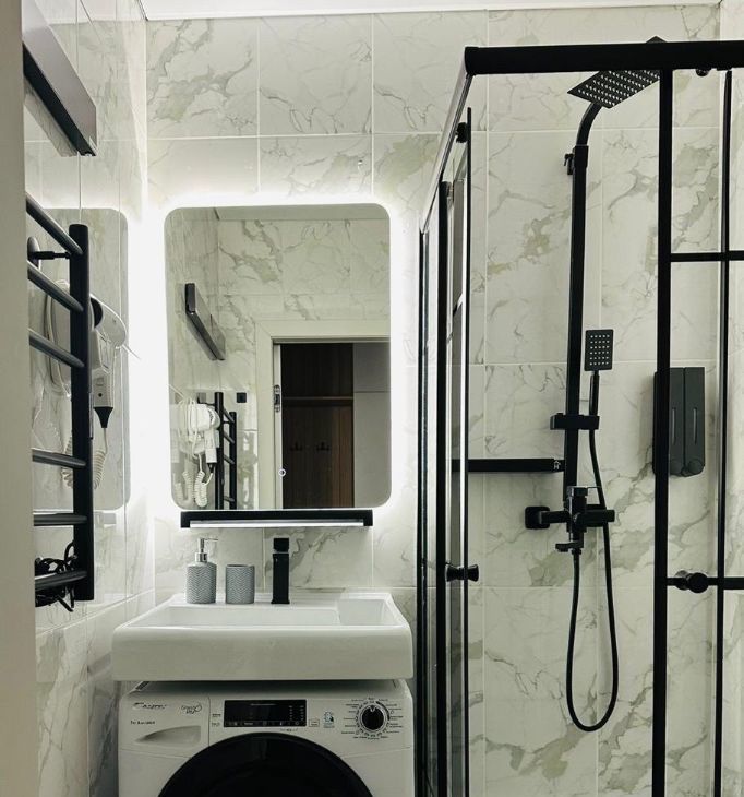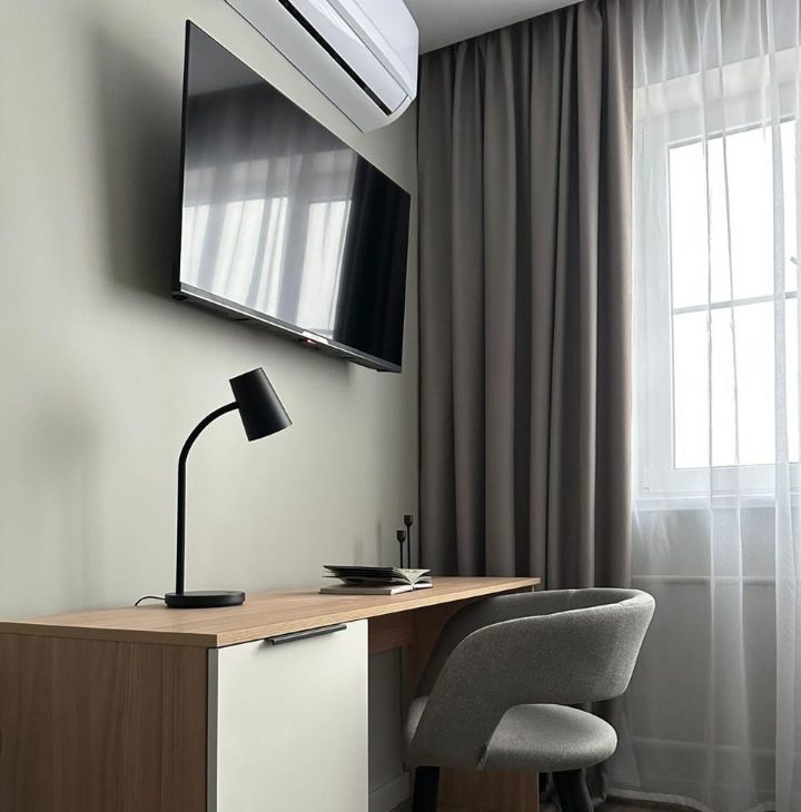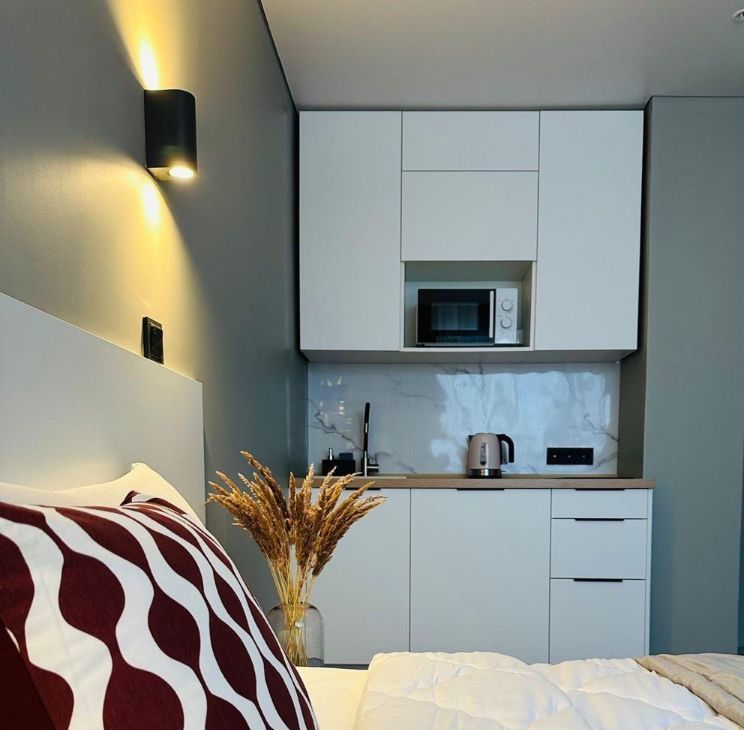 В студии есть всё необходимое для комфортного проживания: кондиционер, холодильник, телевизор и стиральная машина. Кухня и комната оборудованы стильной мебелью. Ванная комната оснащена современной душевой кабиной. Уютная и функциональная планировка позволяет эффективно использовать пространство.