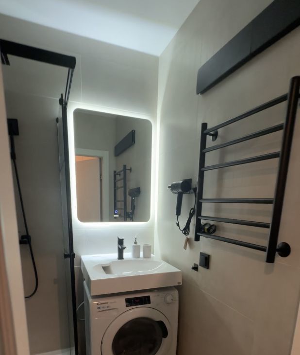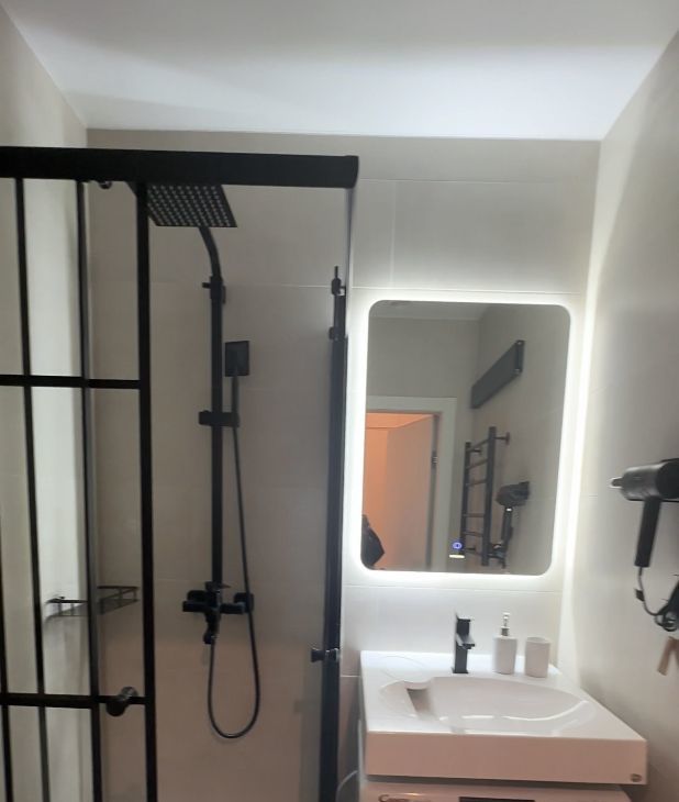 • Ванная комната: Современная сантехника, душевая кабина с тропическим душем, электрический полотенцесушитель, фен.