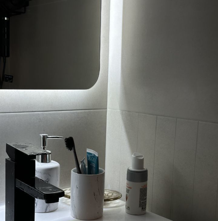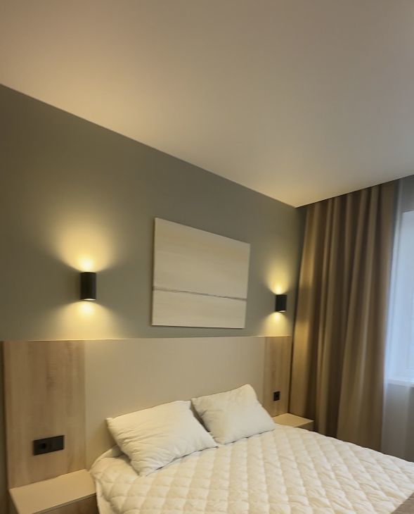 • Освещение: Продумано приятное многоуровневое освещение (стильные прикроватные бра, потолочные светильники, зеркало с подсветкой в ванной).