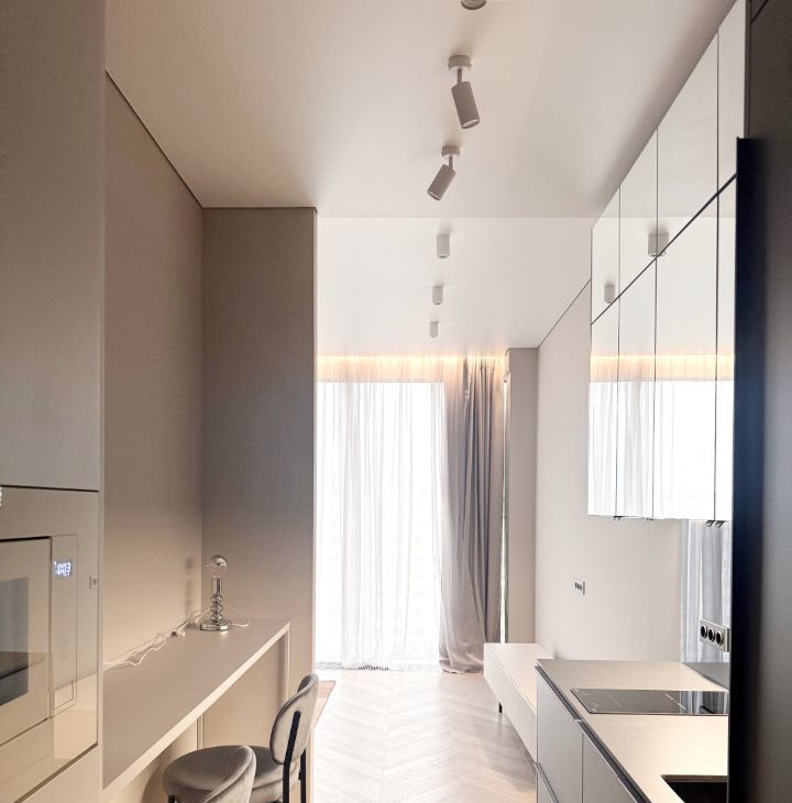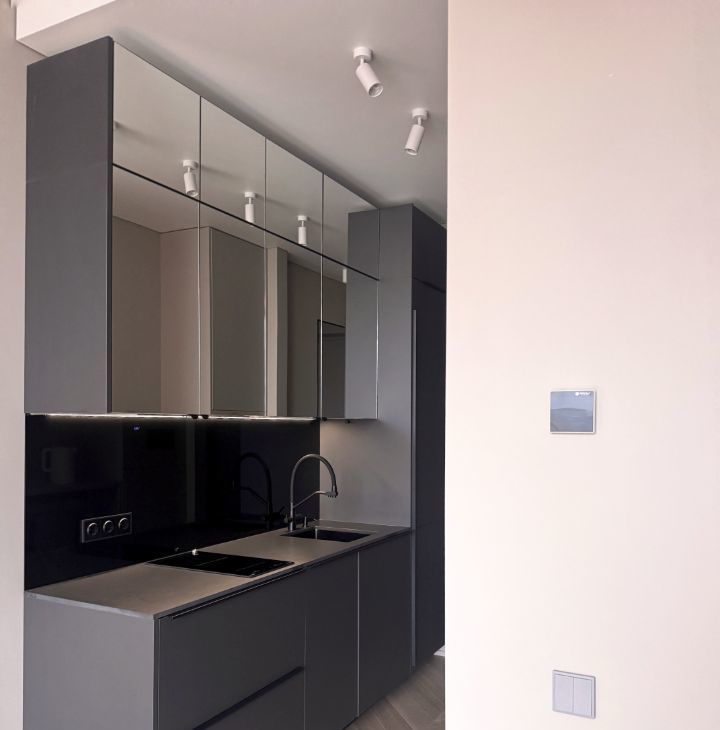 - Кухня с встроенной техникой: посудомоечной машиной, холодильником, микроволновой печью, фильтром для питьевой воды и умным электрочайником.