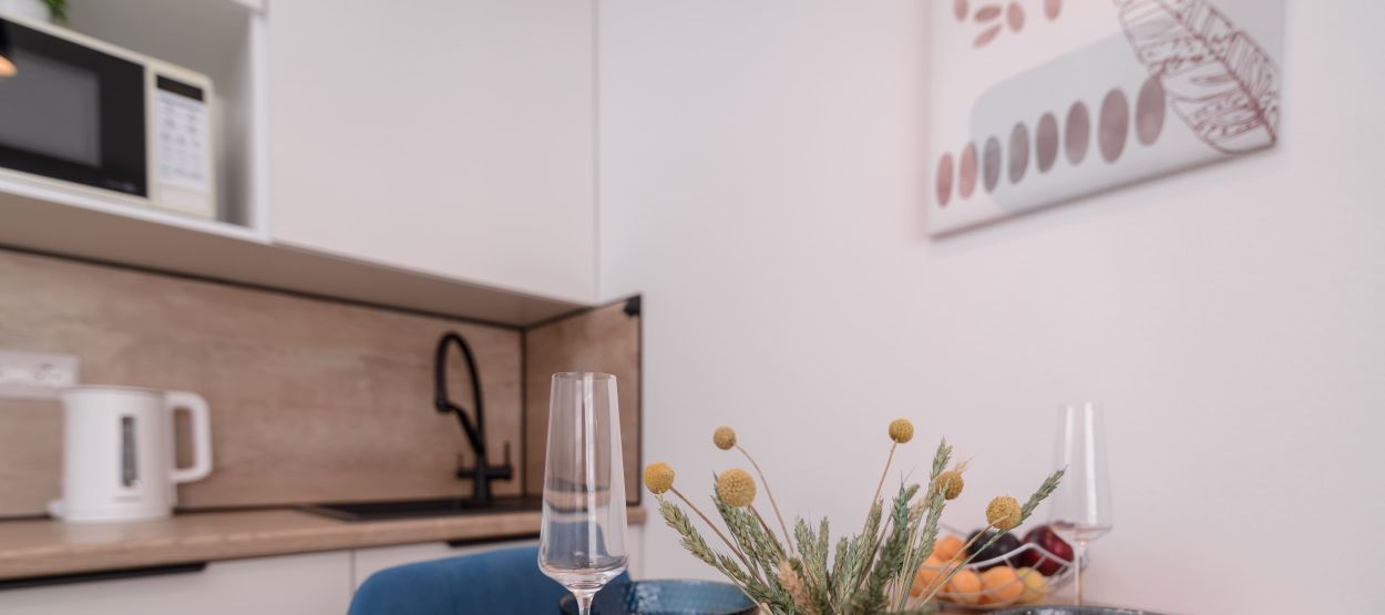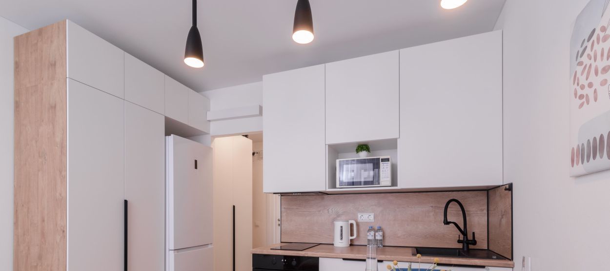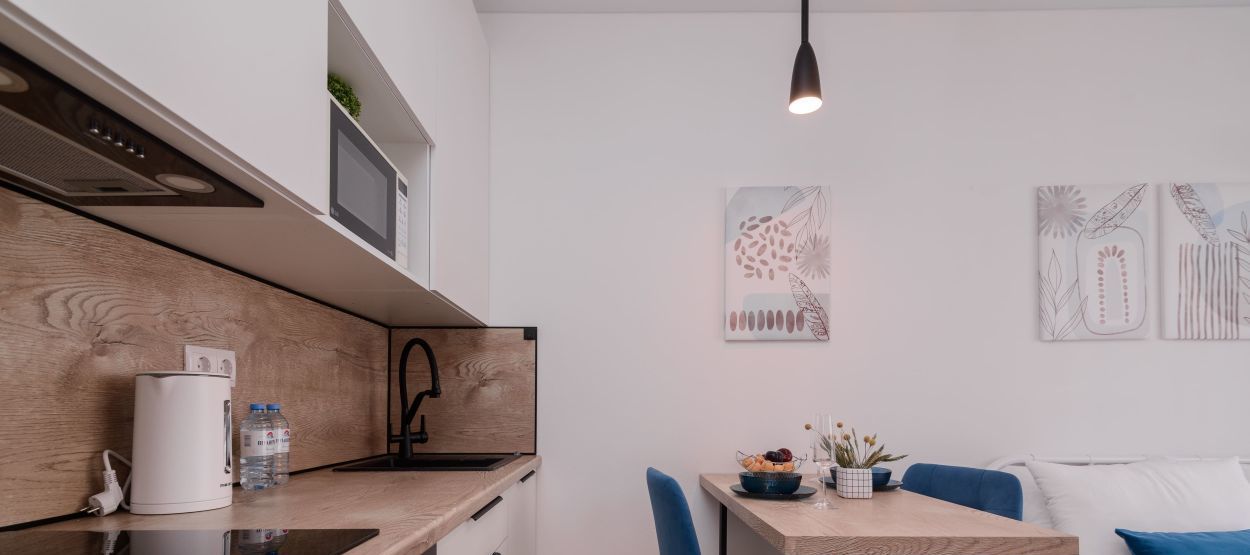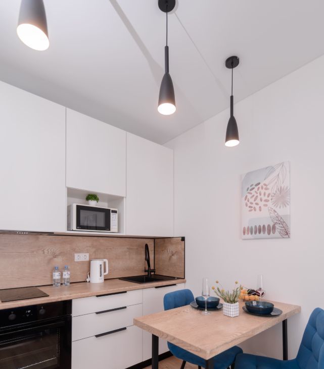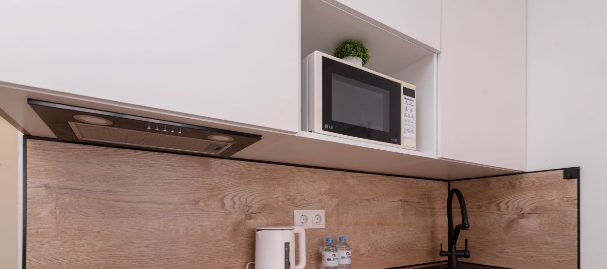 - Полноценная кухня (электроплита, холодильник, микроволновка, чайник)