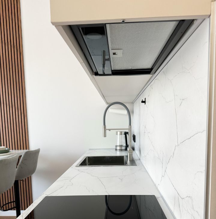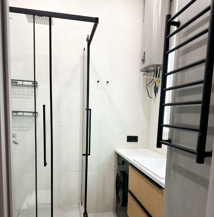 Большой полноценный холодильник с морозильной камерой, тв, кондиционер, посудомоечная машина, духовой шкаф, варочная панель и вытяжка, водонагреватель, стиральная машина с сушкой, электрочайник.