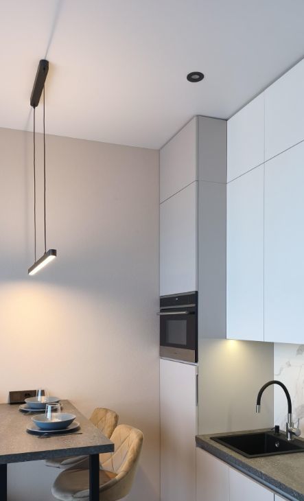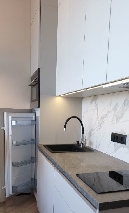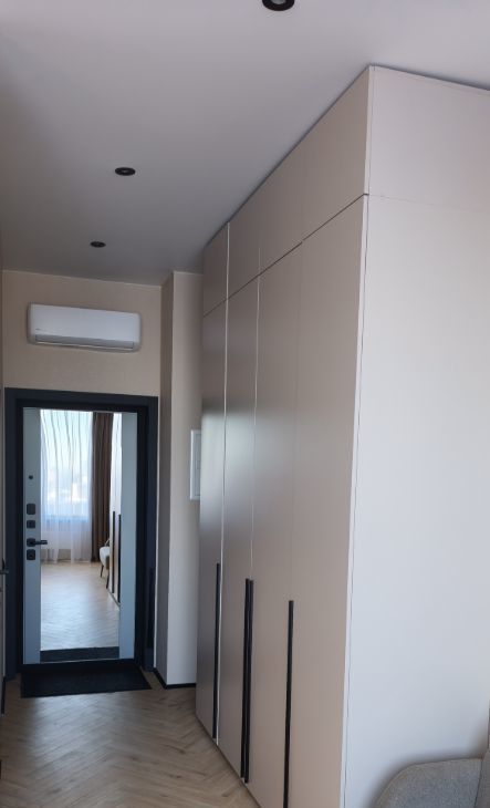 Бытовая техника: кондиционер, варочная панель, вытяжка, духовой шкаф и СВЧ, холодильник, телевизор, стиральная машина с сушкой.