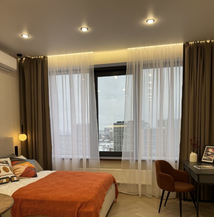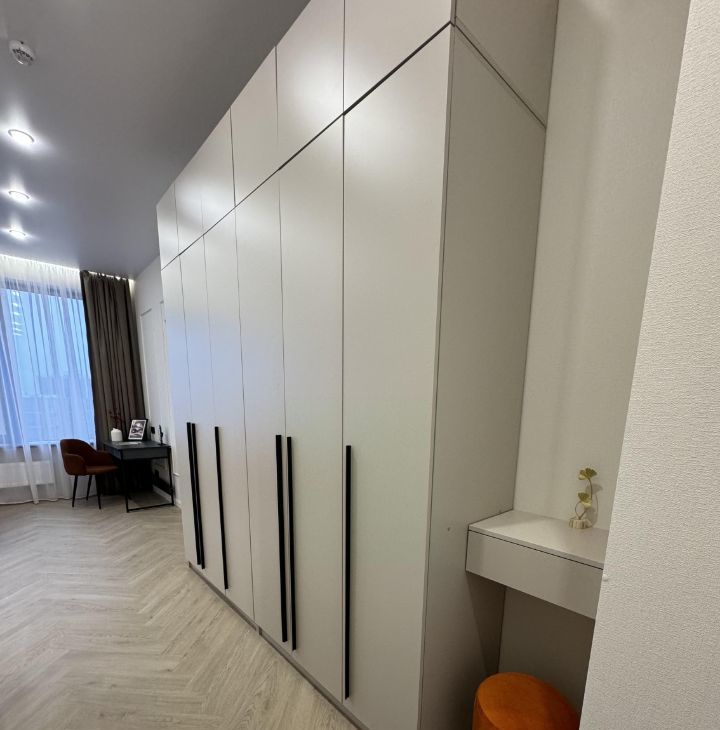 Большой гардероб, кровать 140х200 с ортопедическим матрасом и подъемным механизмом, продуманная зона освещения и зонирования комнаты. Удобная рабочая зона за столом и за подоконником.