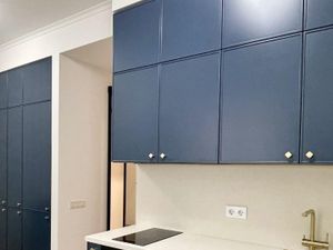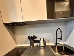 Апартаменты выполнены с дизайнерским ремонтом, что создает атмосферу уюта и гармонии. В просторной жилой зоне площадью 28 кв. м есть все необходимое: удобная мебель, кондиционер и телевизор для комфортного отдыха. Кухня площадью 5 кв. м оборудована современной техникой: холодильник, посудомоечная машина и стиральная машина. В ванной комнате установлена ванна, что позволит расслабиться после рабочего дня.