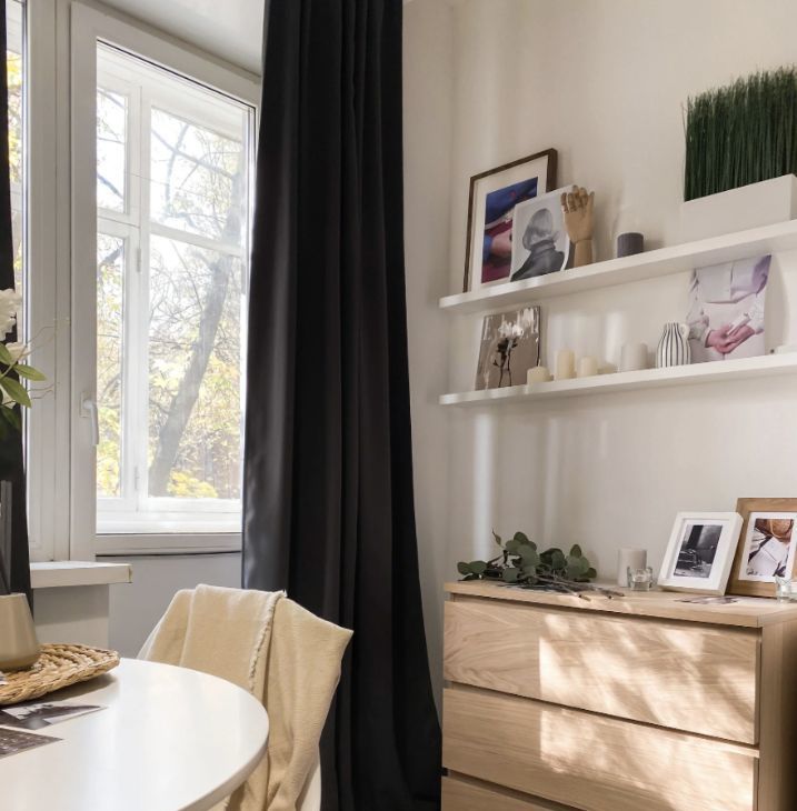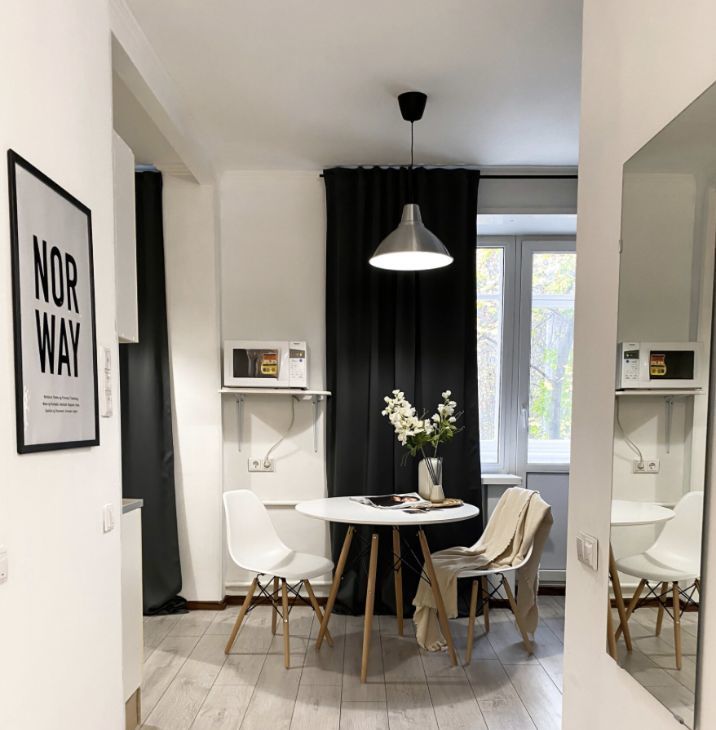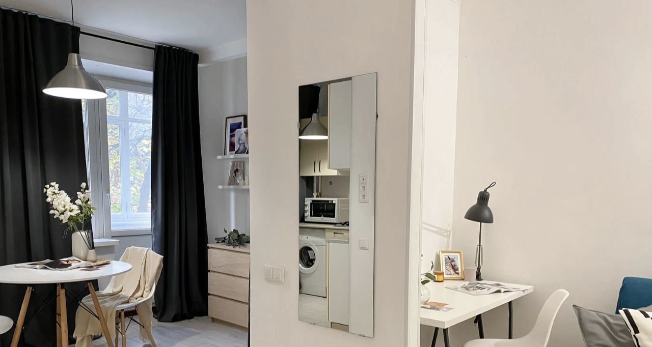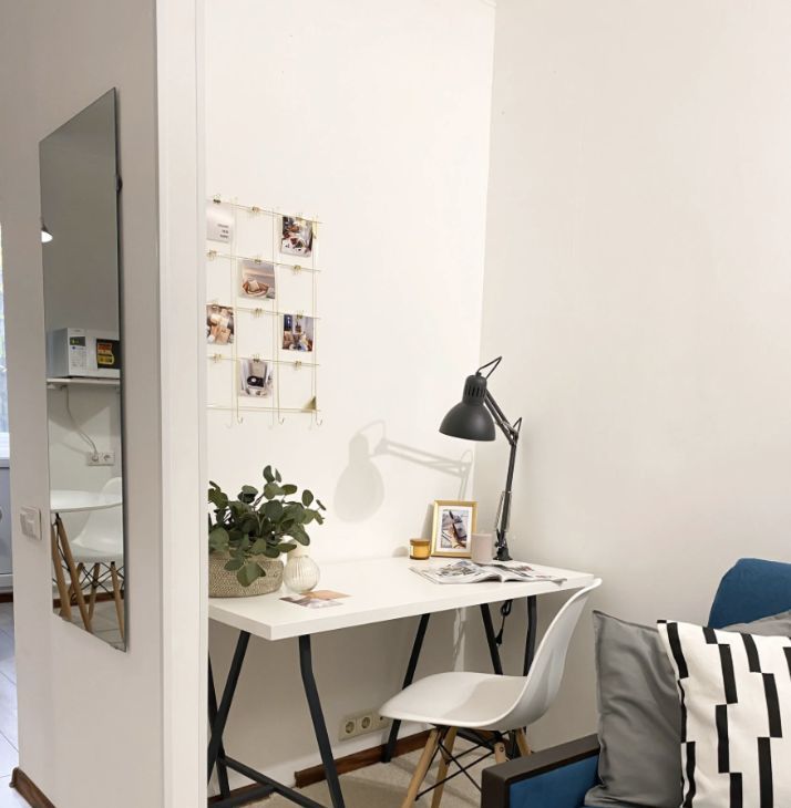 Интерьер продуман таким образом, чтобы вам было удобно жить, отдыхать и работать. В комнате стоит удобный диван, который превращается в полноценное спальное место, а система хранения представлена комодом и полками. Большое зеркало в полный рост создаёт ощущение простора, а рабочий стол со стулом и лампой позволяет организовать комфортную рабочую зону. В студии есть уютный балкон — идеальное место для утреннего кофе или вечернего отдыха. Санузел аккуратный и совмещённый.