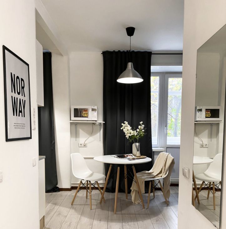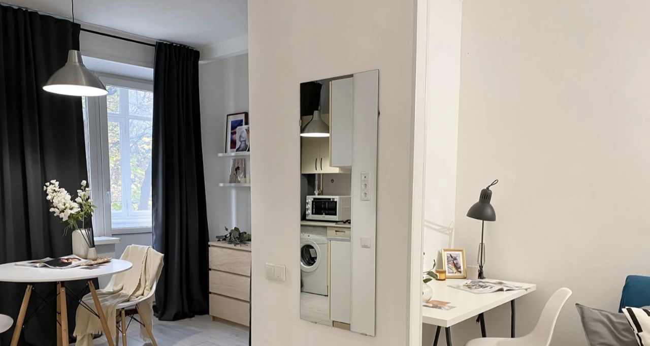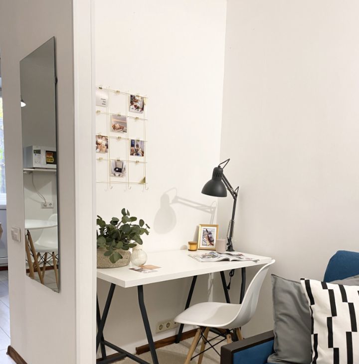 Интерьер продуман таким образом, чтобы вам было удобно жить, отдыхать и работать. В комнате стоит удобный диван, который превращается в полноценное спальное место, а система хранения представлена комодом и полками. Большое зеркало в полный рост создаёт ощущение простора, а рабочий стол со стулом и лампой позволяет организовать комфортную рабочую зону. В студии есть уютный балкон — идеальное место для утреннего кофе или вечернего отдыха. Санузел аккуратный и совмещённый.