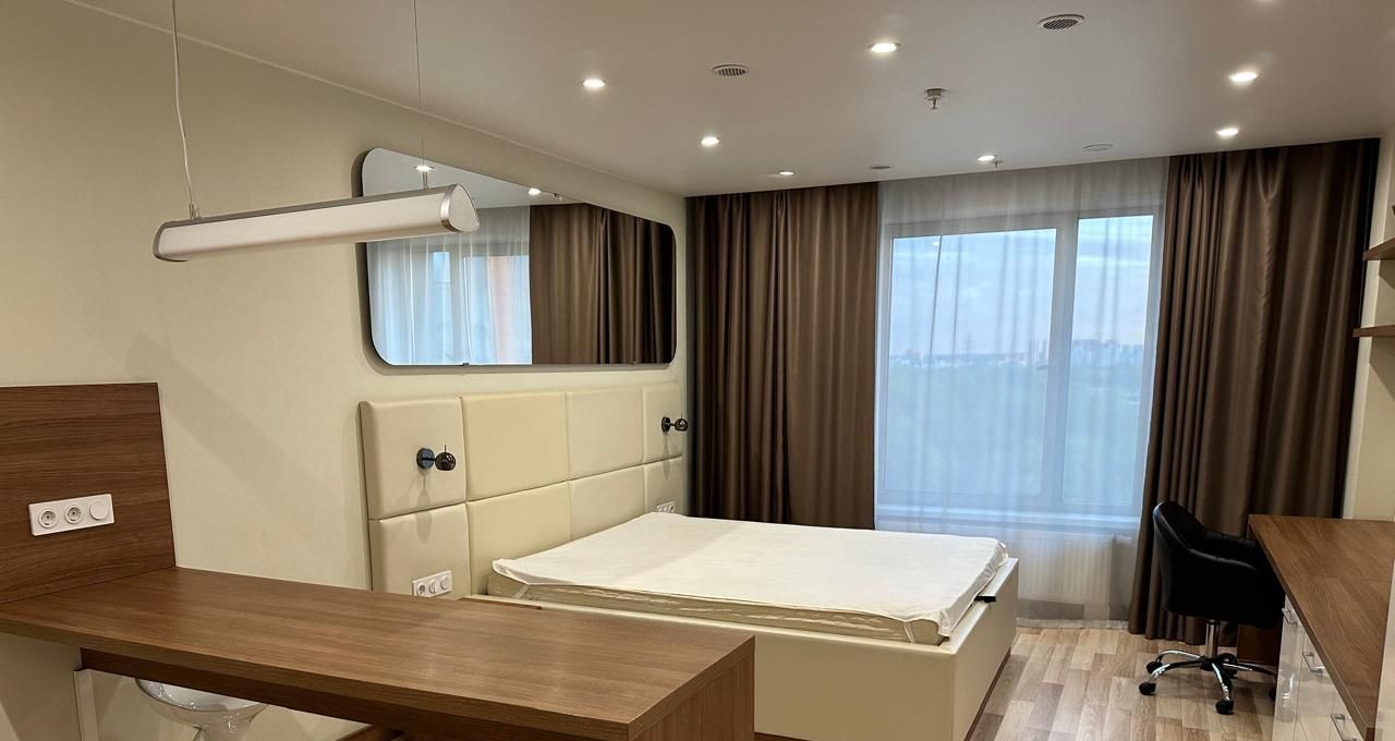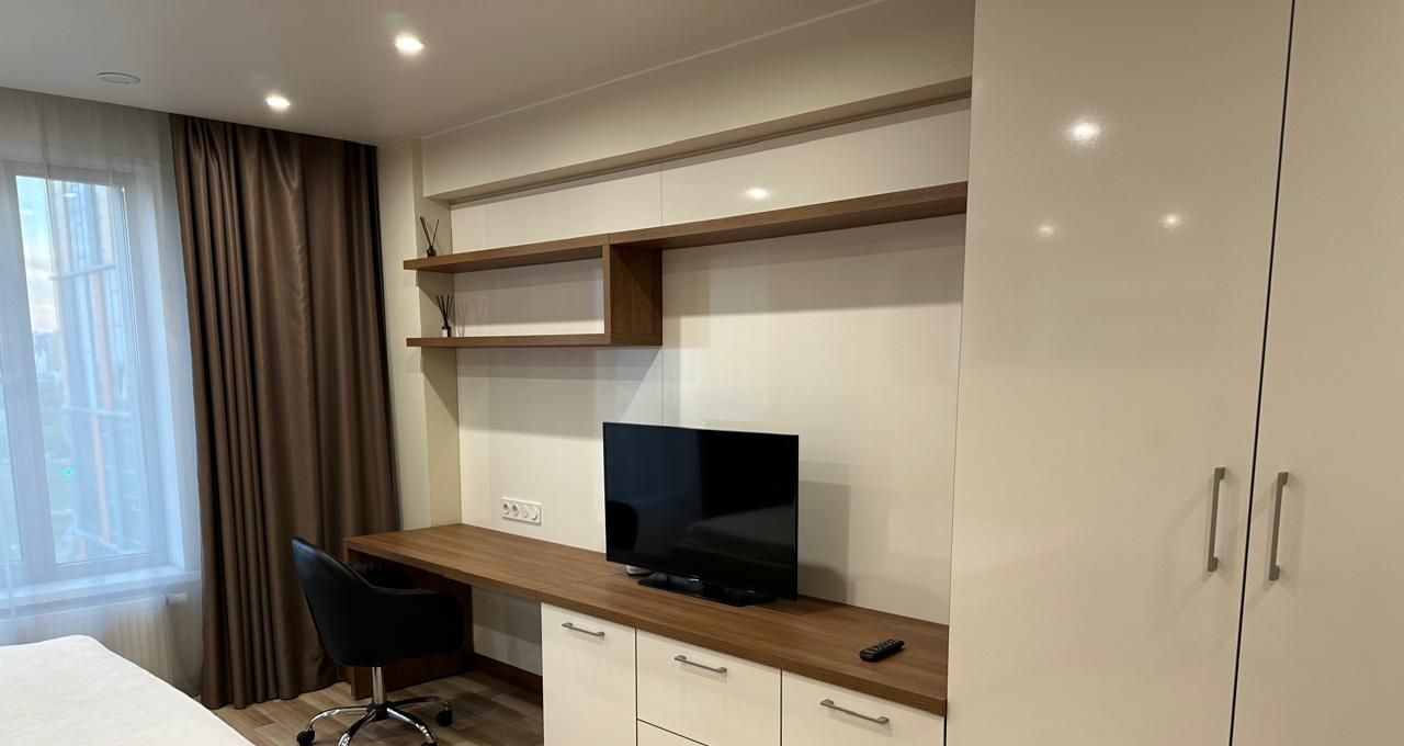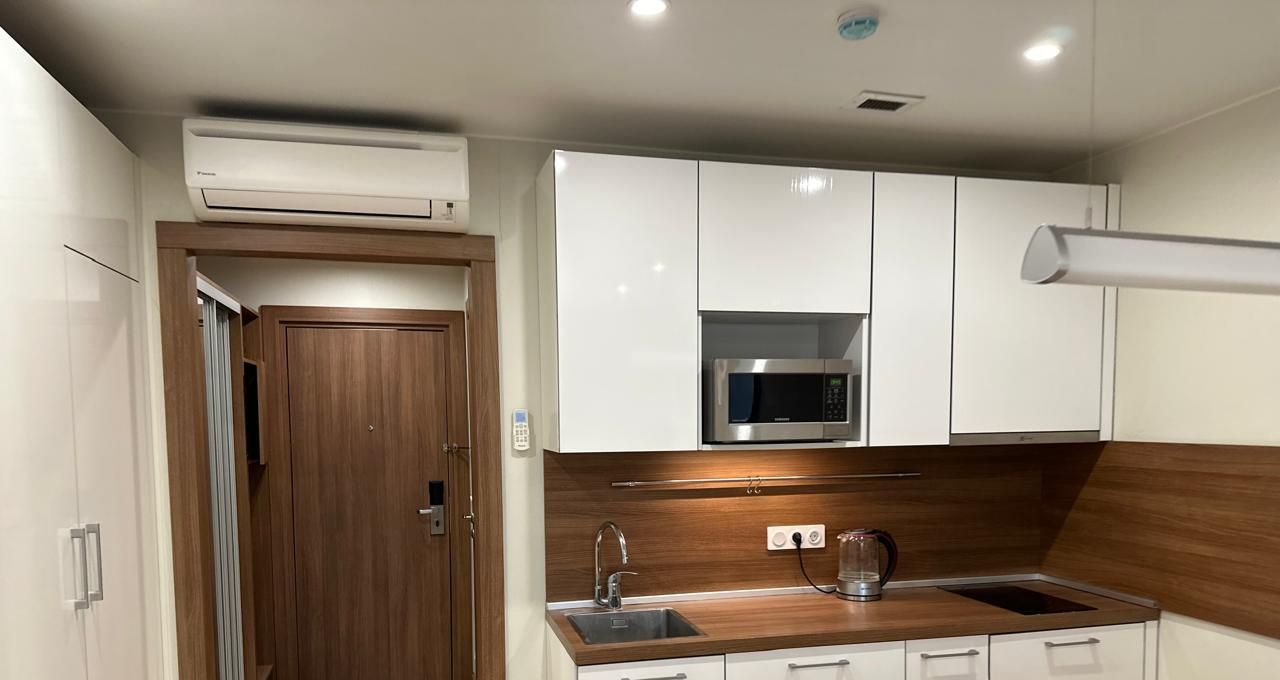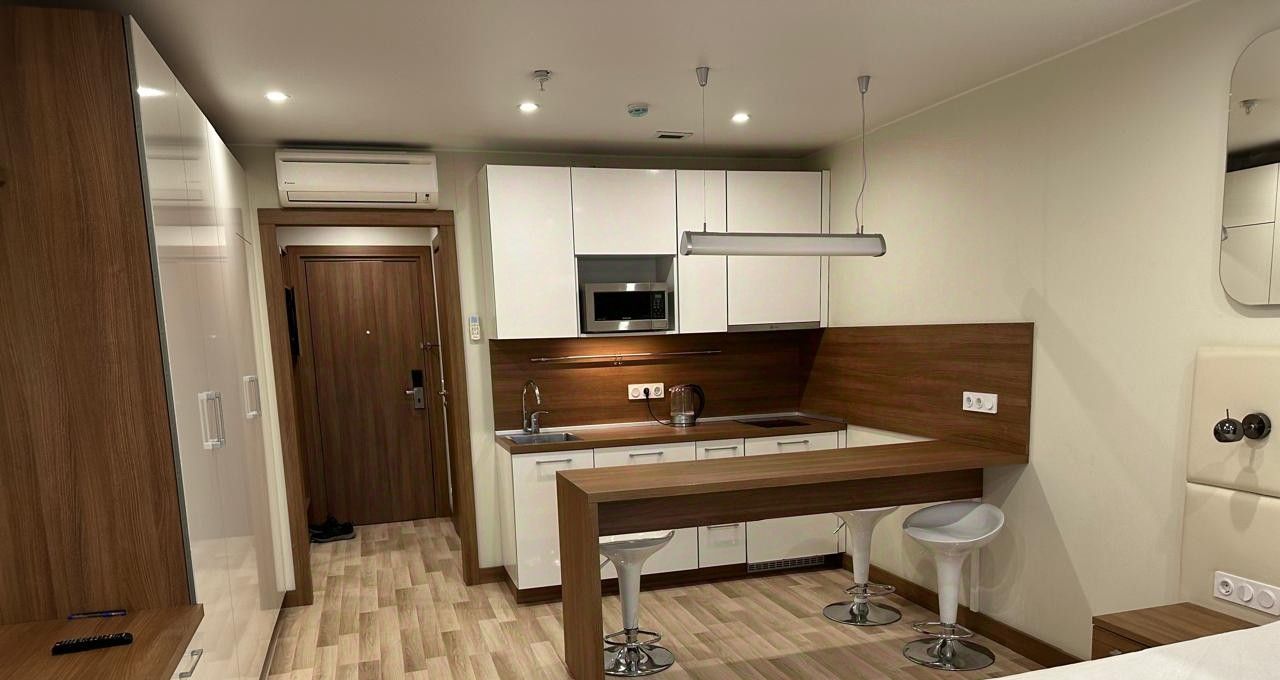 Студия в здании с фитнес-центором и паркингом. Есть кондиционер.