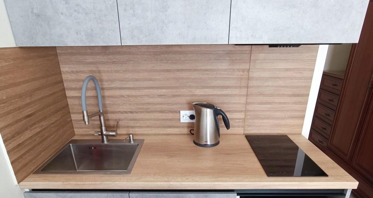 Бытовая техника в наличии: стиральная машина, холодильник, варочная панель, микроволновая печь, электрочайник, телевизор.