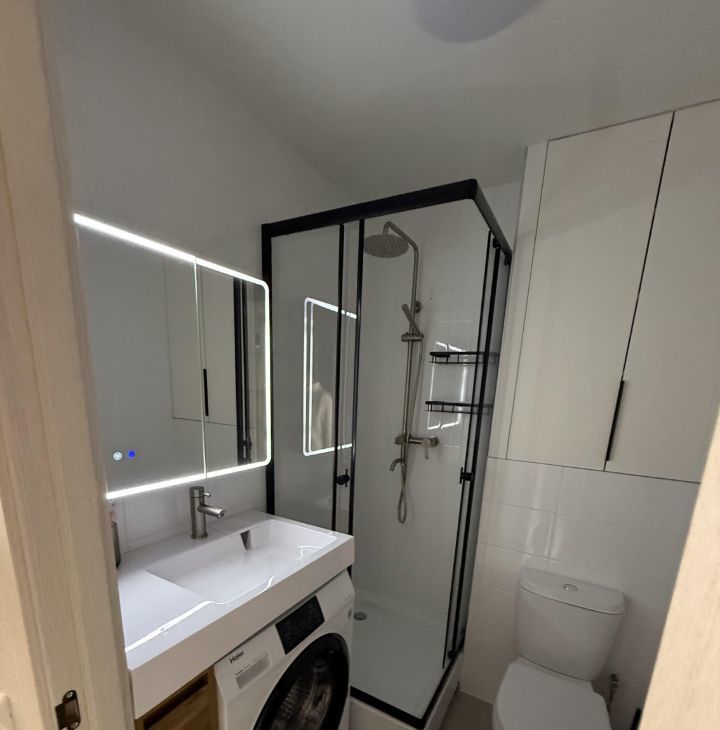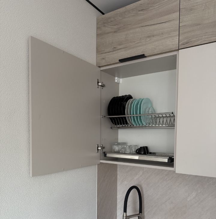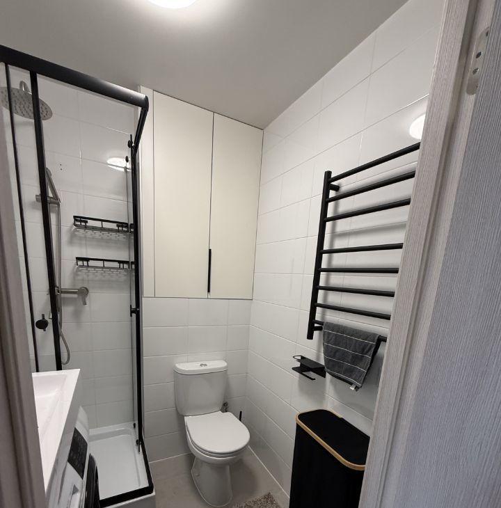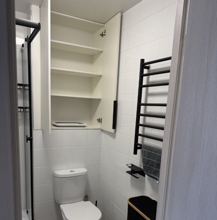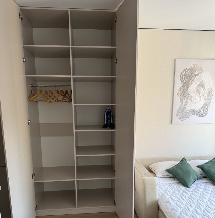 Много систем хранения — вместительные шкафы, кухня до потолка, встроенный шкаф в ванной, шкаф у раковины. При входе пуф, крючки для верхней одежды.
