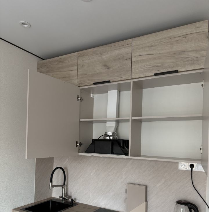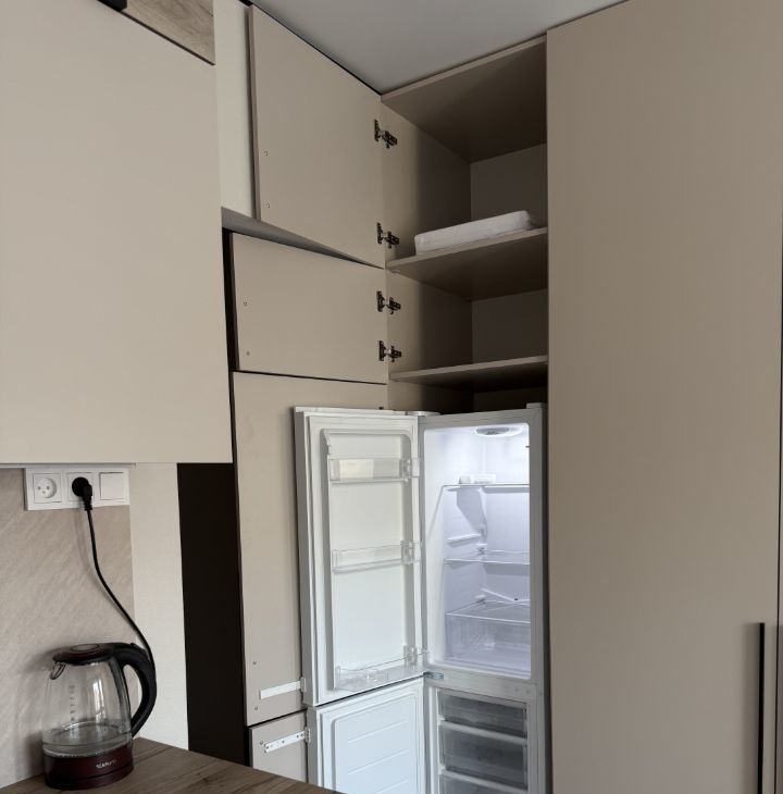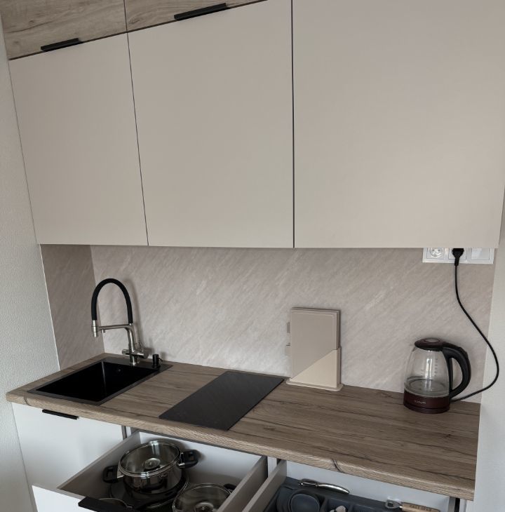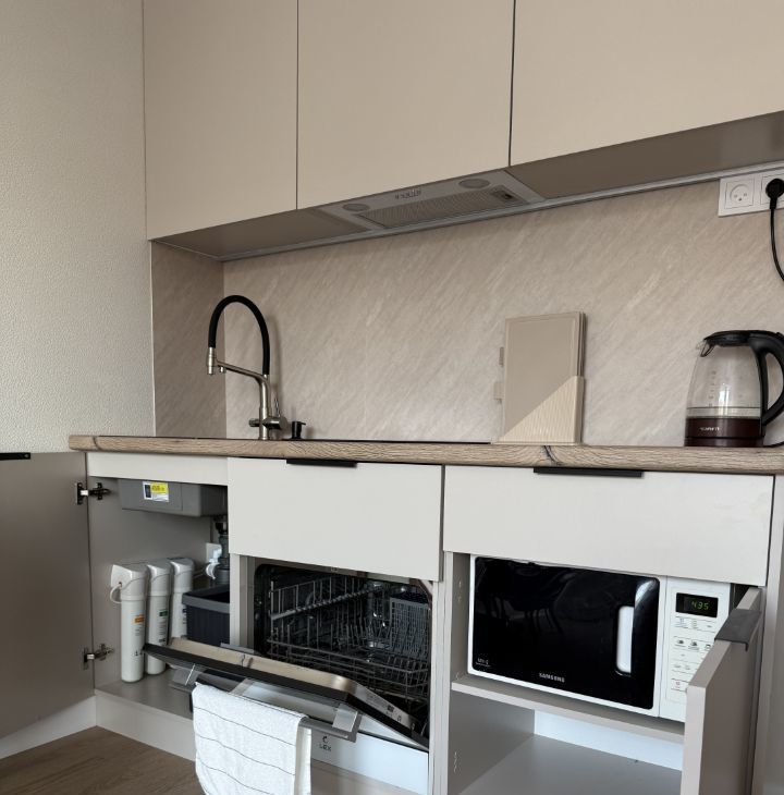 Кухня: Индукционная варочная панель, вытяжка, посудомоечная машина!, СВЧ-печь, чайник. Установлен фильтр для питьевой воды.