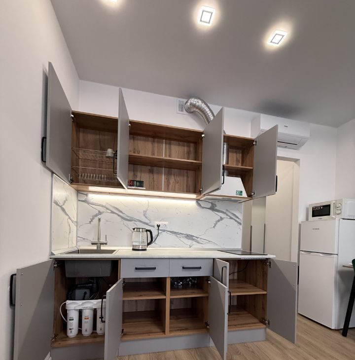 Техника в квартире: холодильник, стиральная машина, варочная панель, микроволновая печь, чайник, кондиционер, роутер, 3-ех ступенчатый фильтр для воды, Смарт-TV.