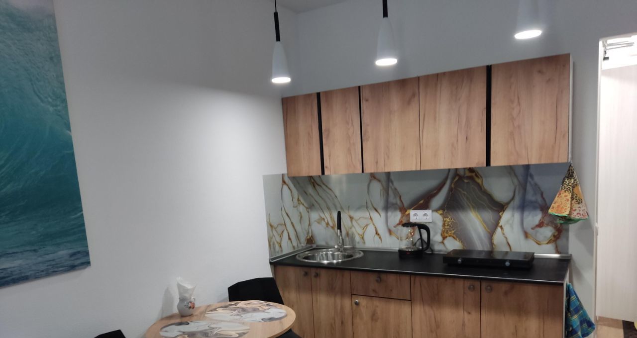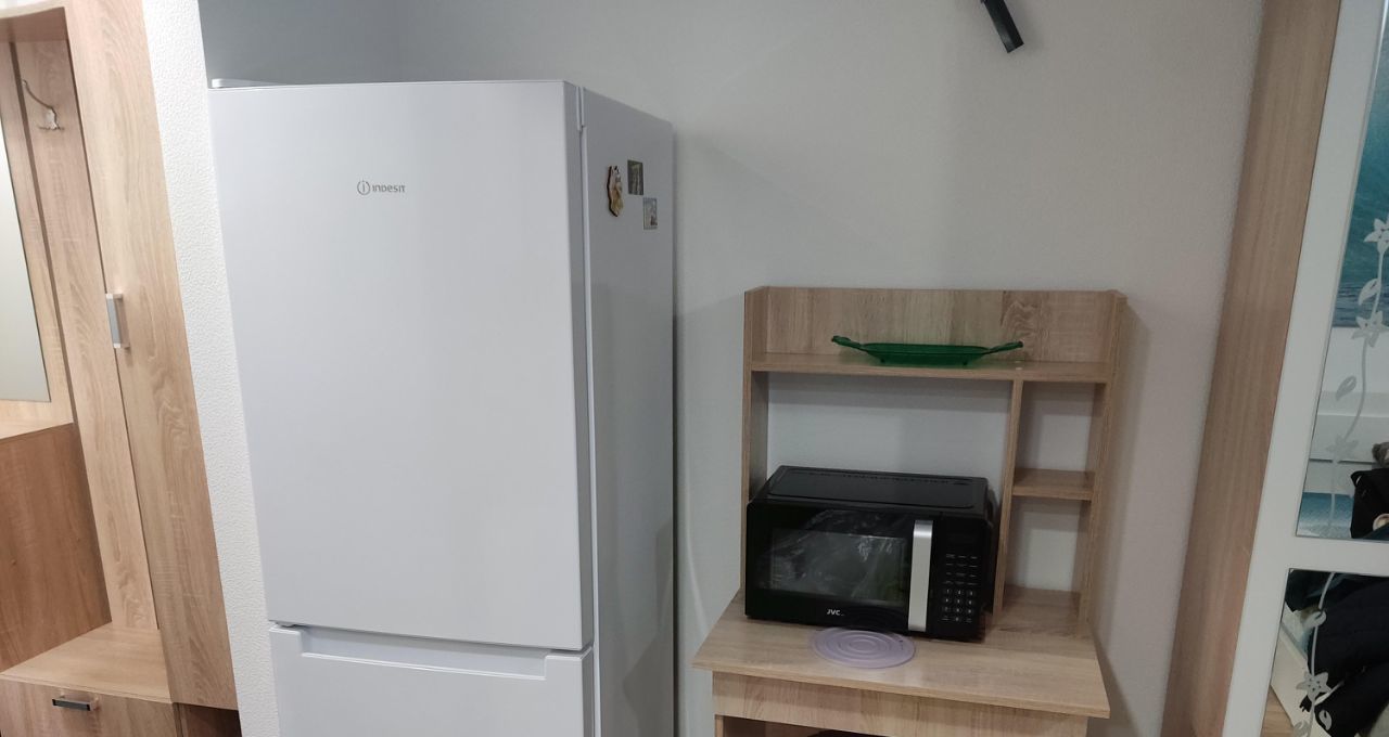 Общая площадь 20 кв.м, комната+кухня: 14,9 кв.м. Санузел совмещенный. Есть вся необходимая мебель. Из техники: электрическая плита, холодильник, чайник, микроволновая печь, стиральная машина, телевизор. Интернет подключается отдельно.