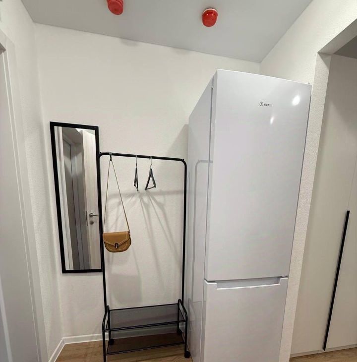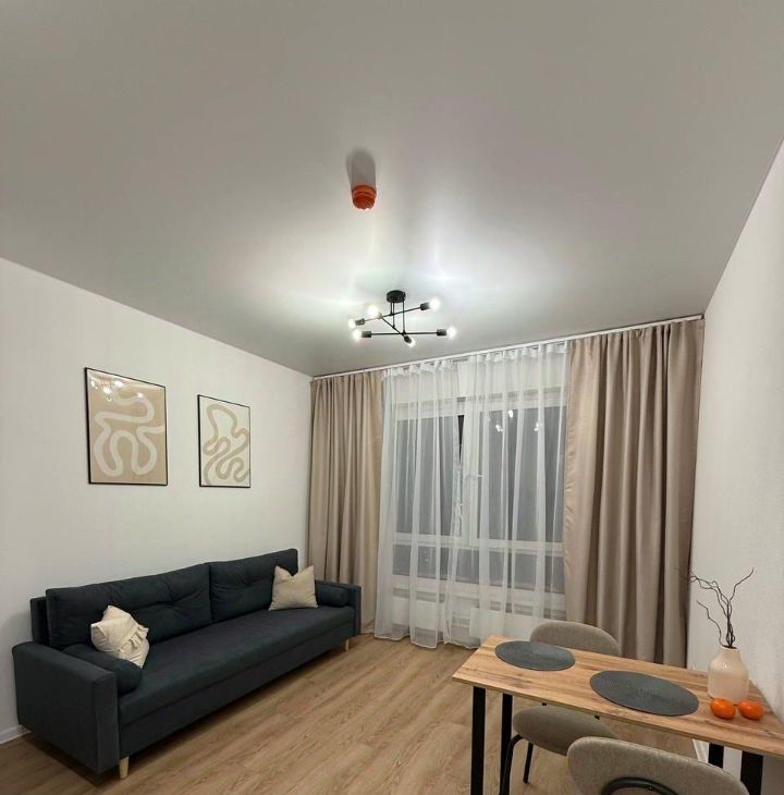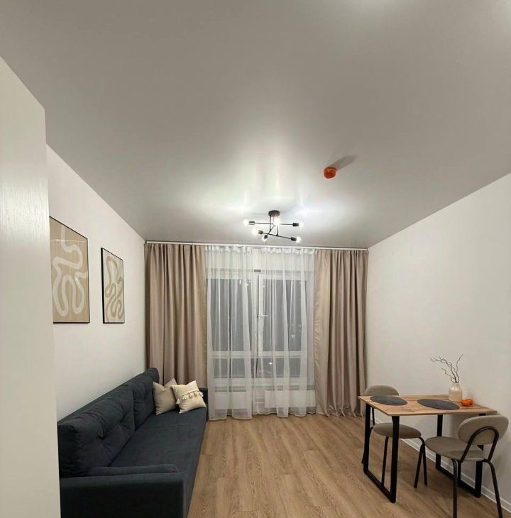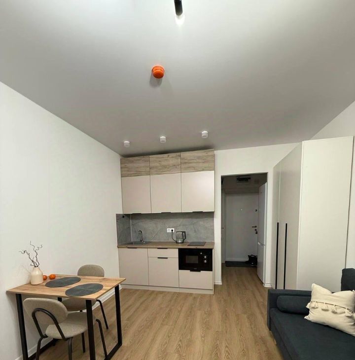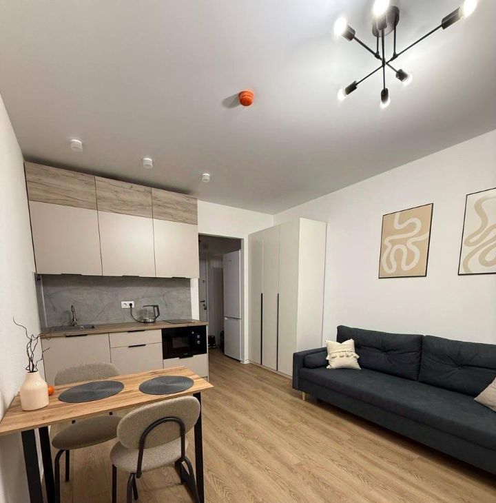В квартире выполнен евроремонт, что гарантирует современный и стильный интерьер. Студия оснащена всем необходимым для комфортного проживания: есть мебель как в комнате, так и на кухне. На кухне вас ждёт холодильник, а в ванной комнате — душевая кабина и стиральная машина. Окна выходят во двор, поэтому в квартире всегда тихо и спокойно.