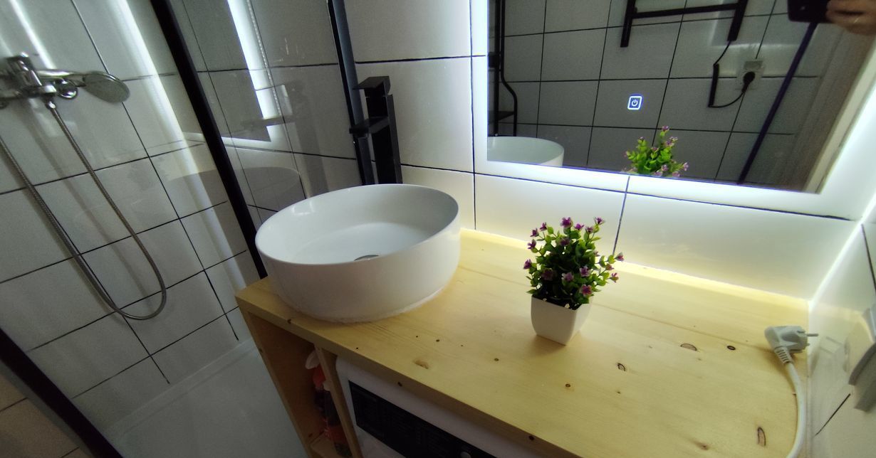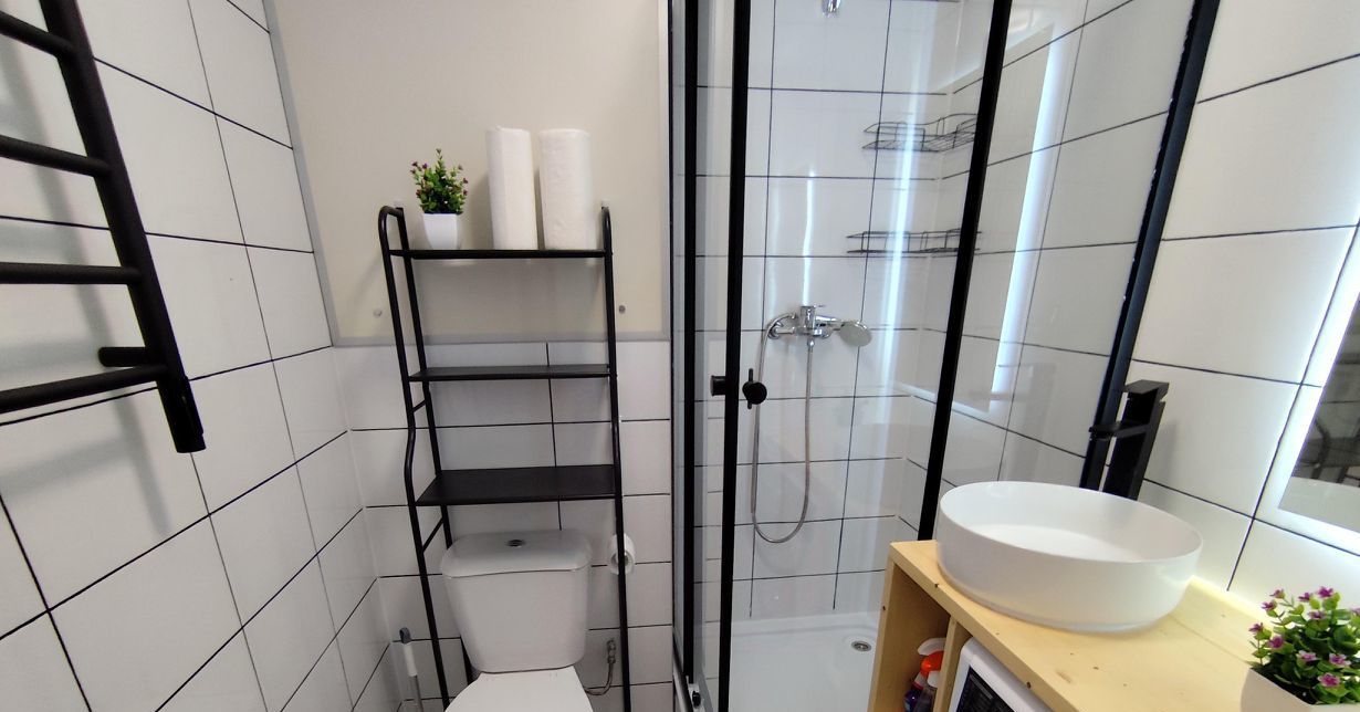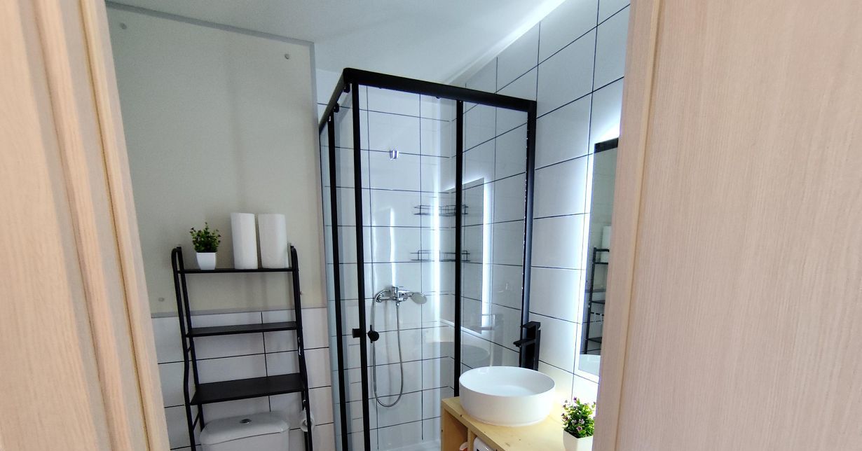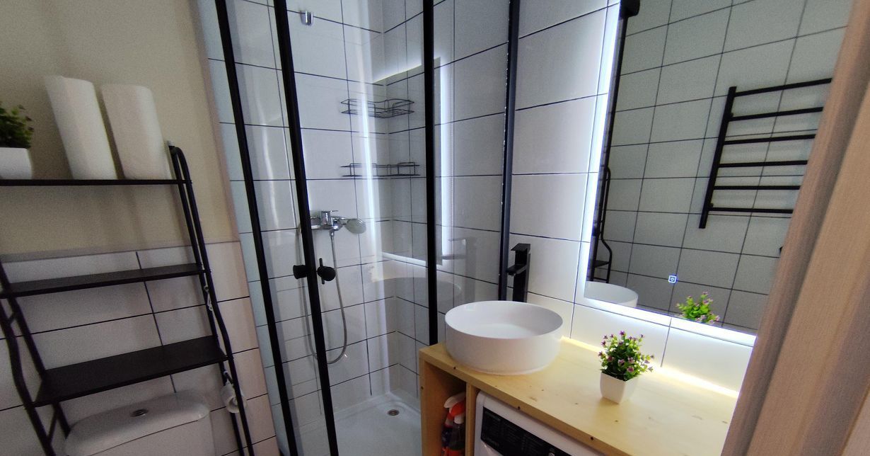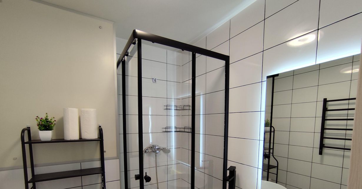 Ванная комната оборудована душевой кабиной и современными сантехническими приборами.