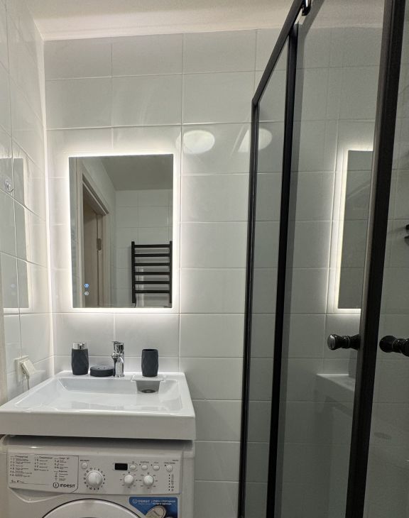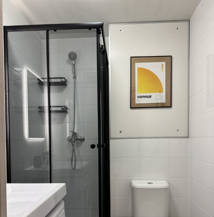 Санузел совмещенный, выполнен в современном стиле с душевой кабиной и качественной сантехникой. В прихожей установлен вместительный шкаф для хранения вещей.