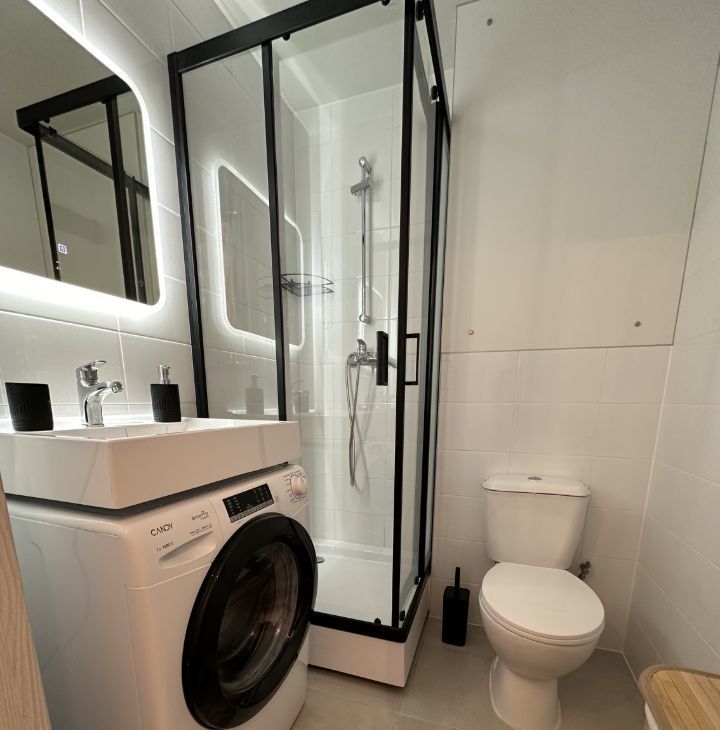 В санузле душевая кабина , корзина для белья , стиральная машина и сушилка оборудована к стене ( подвесная)