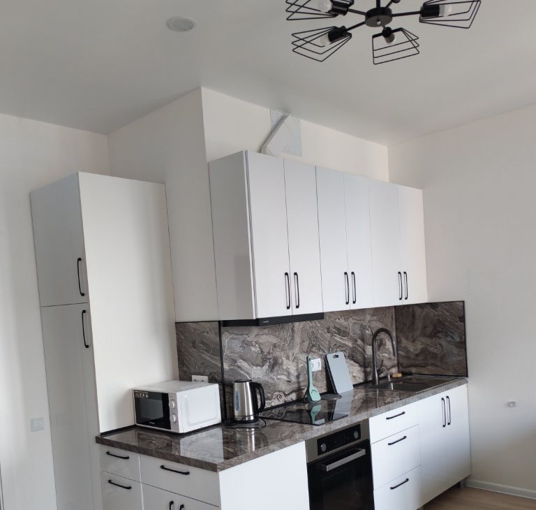 Мебель новая, вся бытовая техника (индукционная плита, духовой шкаф, холодильник, телевизор, стиральная машина), посуда для индукции есть.