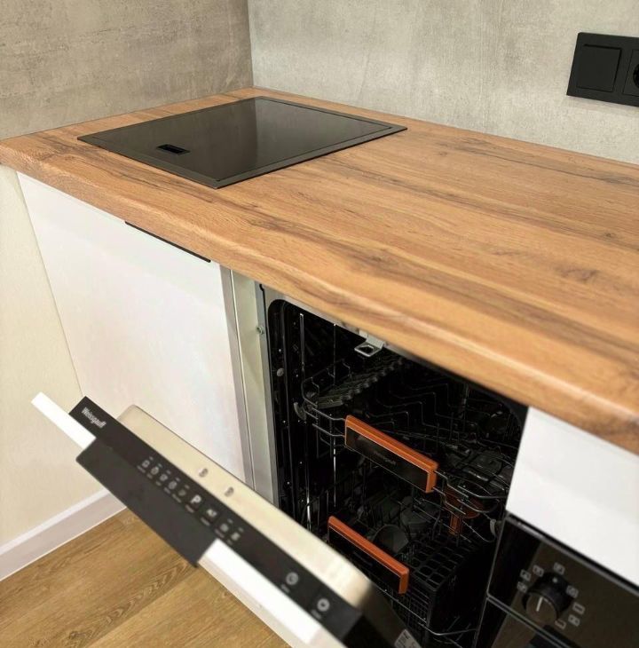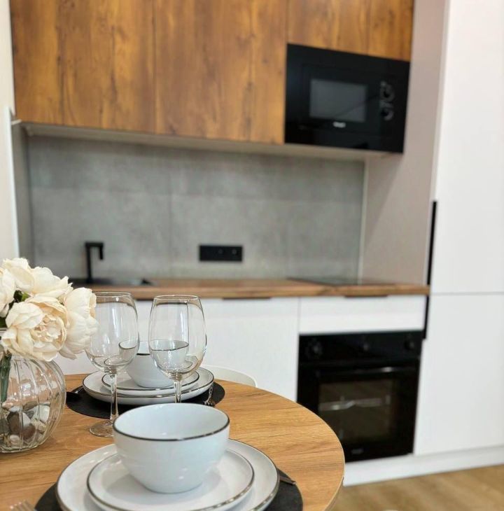Удобная кухонная зона с новой встроенной техникой, красивой посудой и столовыми принадлежностями за круглым столом могут разместиться 4 человека.