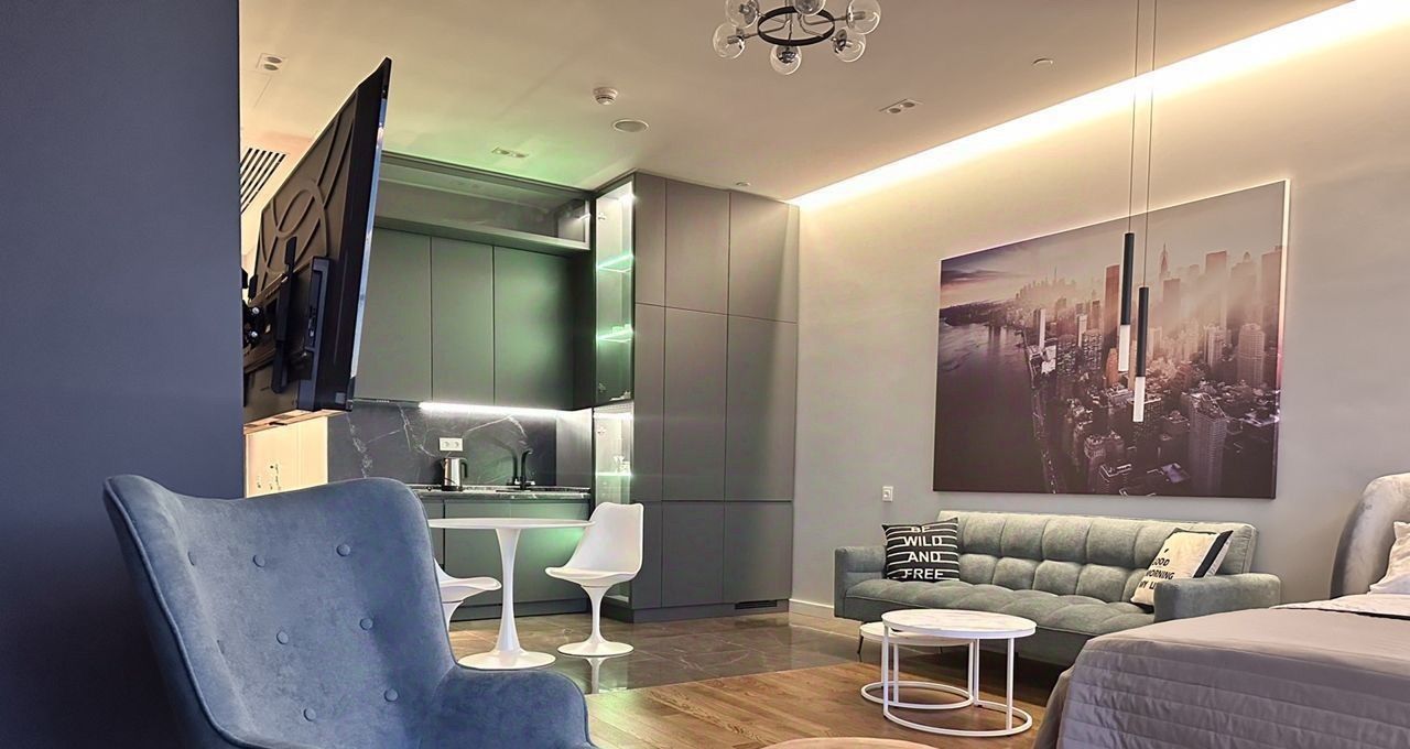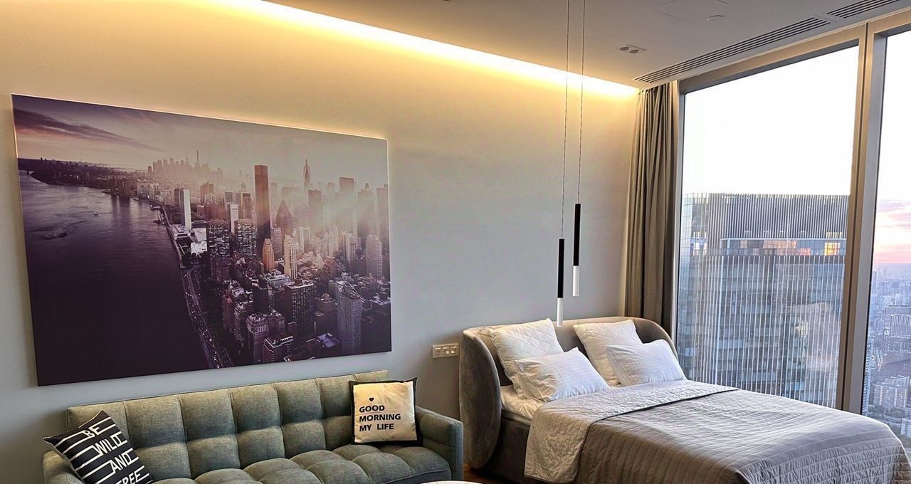 Апартаменты расположены на высоком этаже с панорамными видами на центр Москвы и Москва-реку. Современный дизайнерский ремонт, качественные материалы, полностью меблированы и оснащены всей необходимой бытовой техникой. Просторная кухня-гостиная, изолированная спальня, функциональная планировка, большие окна в пол.