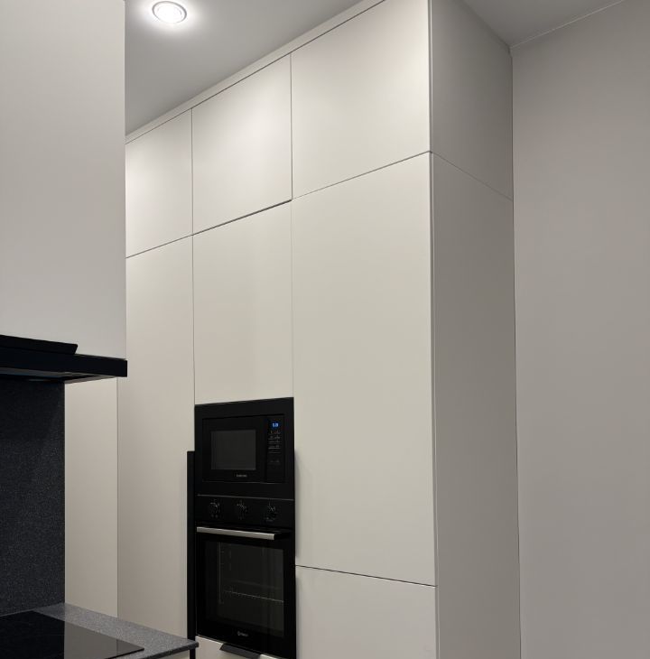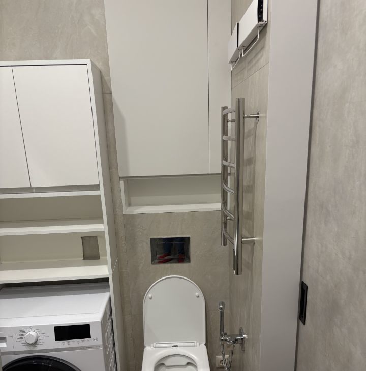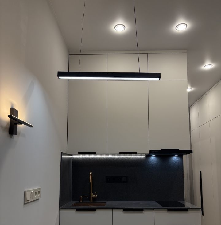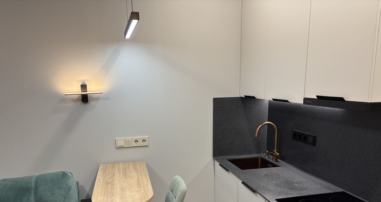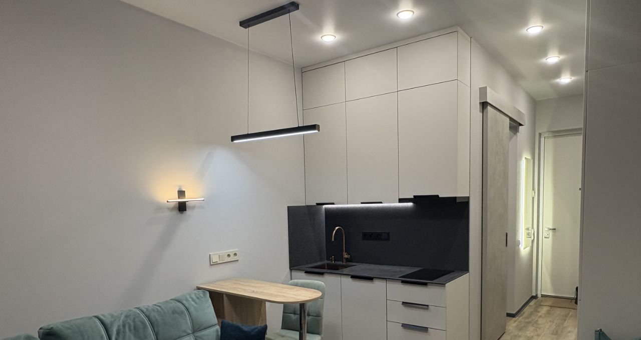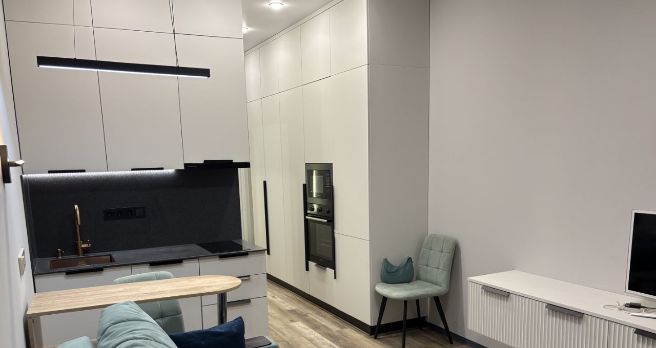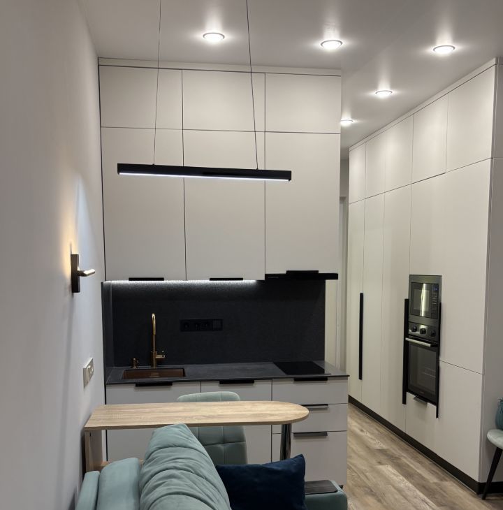 Сделан качественный ремонт из дорогих материалов - в студии встроенные системы хранения, удобная кухня со встроенной техникой, каменная столешница и различные сценарии освещения
