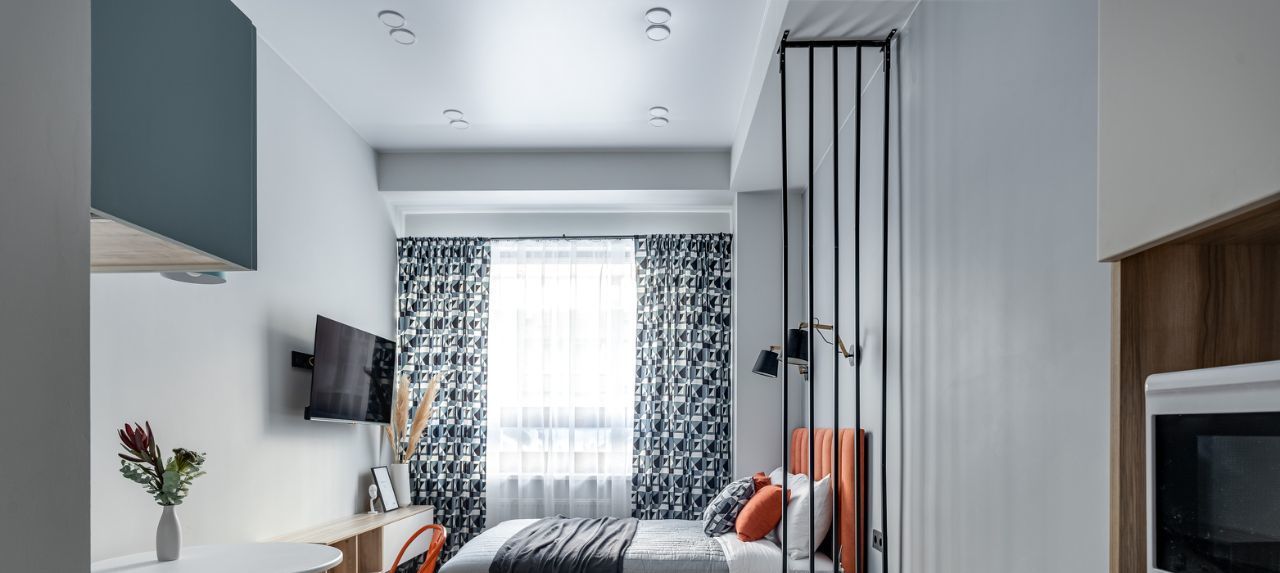 Уютная студия с высокими потолками в современном жилом корпусе с лобби, камином и круглосуточной охраной.