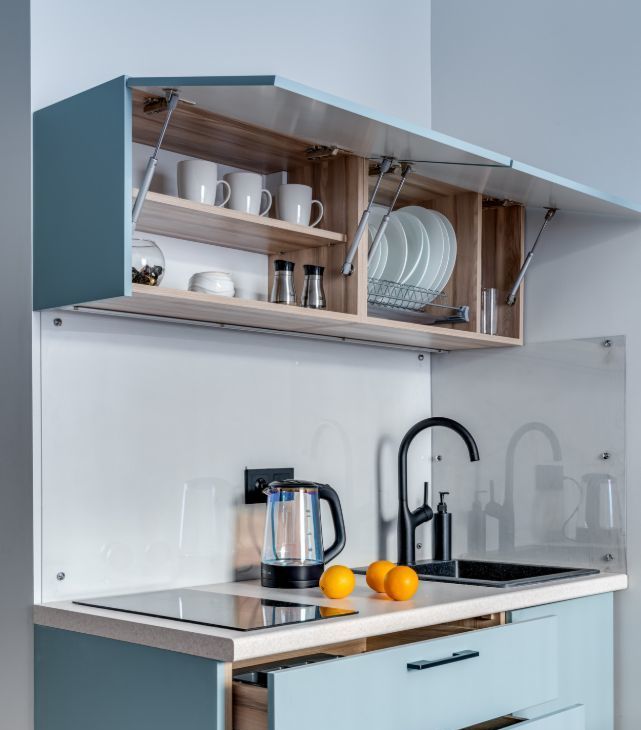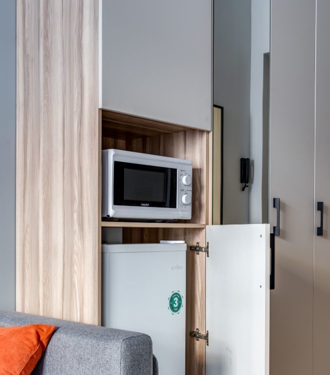 Все необходимое для приема и приготовления пищи: холодильник с морозильной камерой, микроволновая печь, чайник, посуда, столовые приборы.