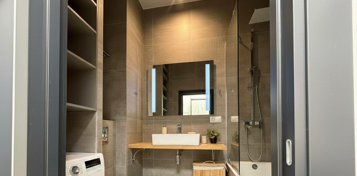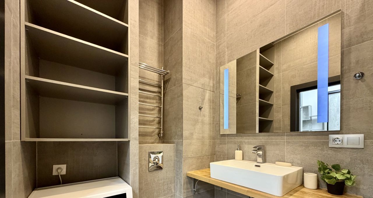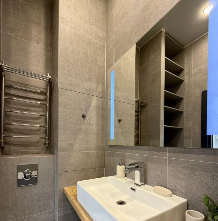 Санузел совмещенный, оборудован ванной, тропический душ, тёплые полы.