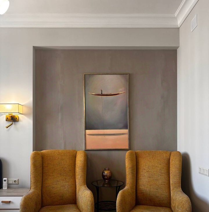 Двуспальная кровать и пара кресел для релакса, а для приема пищи стеклянный обеденный стол и телевизор. Ведь однажды человек во время обеда не посмотрел ютьюб и чуть не умер.