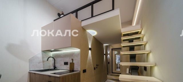 На первом уровне - кухонная зона с барной стойкой, совмещенная с гостиной, гардеробная и санузел, на втором - спальная зона.