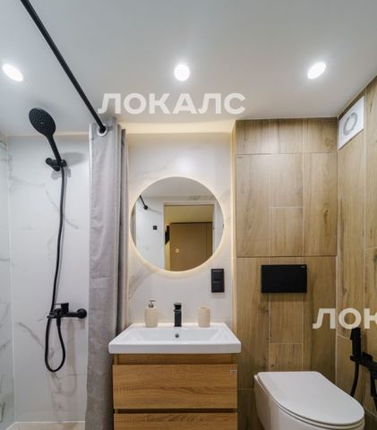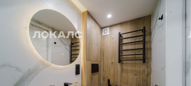 Санузел оборудован теплыми полами, гигиеническим душем, электрическим полотенцесушителем, зеркалом с подсветкой.