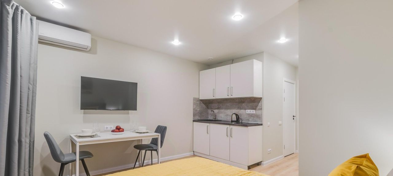 В квартире сделан дизайнерский ремонт, который придаёт пространству уникальный стиль и комфорт. Просторная комната со всей необходимой мебелью, а также оборудованная кухня с современной техникой: кондиционер, холодильник, телевизор и стиральная машина. Санузел совмещённый, в нём установлена душевая кабина. Окна выходят на улицу, поэтому в квартире всегда светло и уютно.