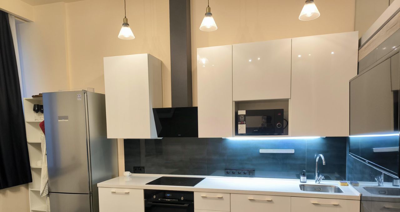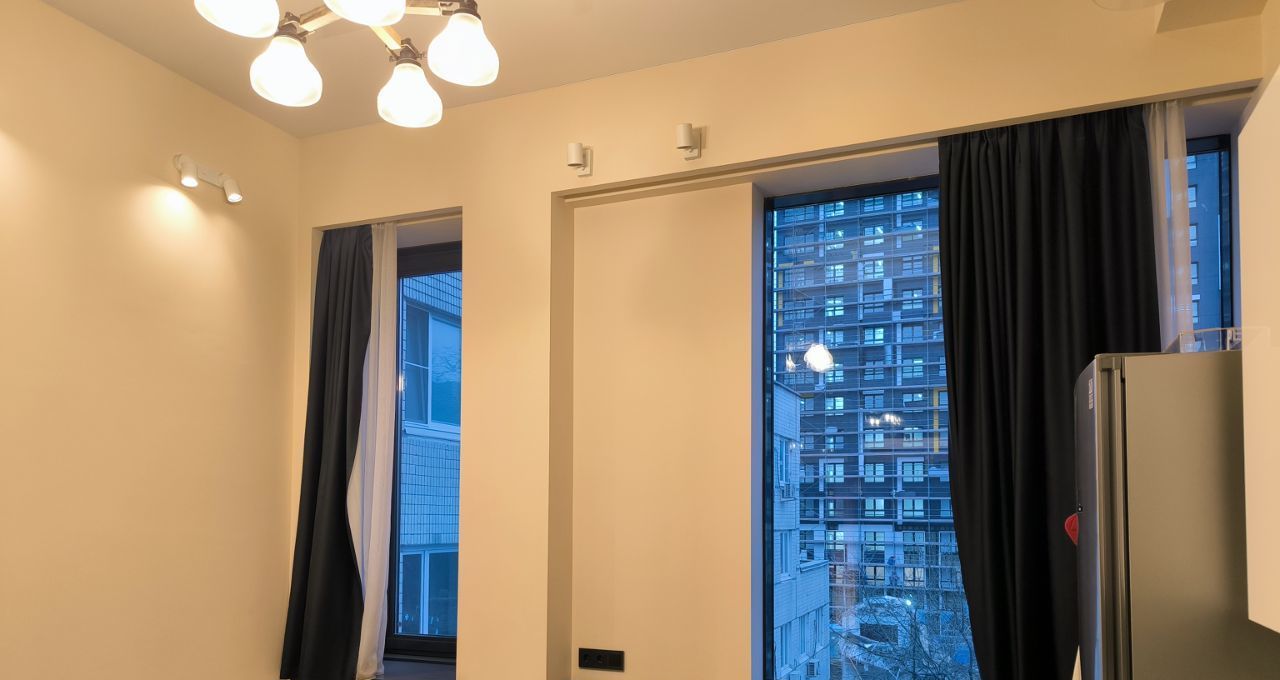 В студии есть всё необходимое для комфортного проживания: качественная мебель, кондиционер, холодильник, посудомоечная и стиральная машины, а также телевизор. Просторный санузел совмещённый, оснащён ванной. Окна выходят во двор, поэтому в квартире всегда тихо и спокойно.