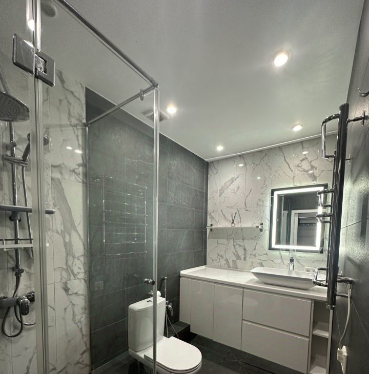 Высокие потолки, современный дизайн, гардеробная, барная стойка, вся необходимая бытовая техника: посудомойка, кондиционер, очиститель воздуха Dyson, автоматические шторы blackout, дизайнерское освещение.