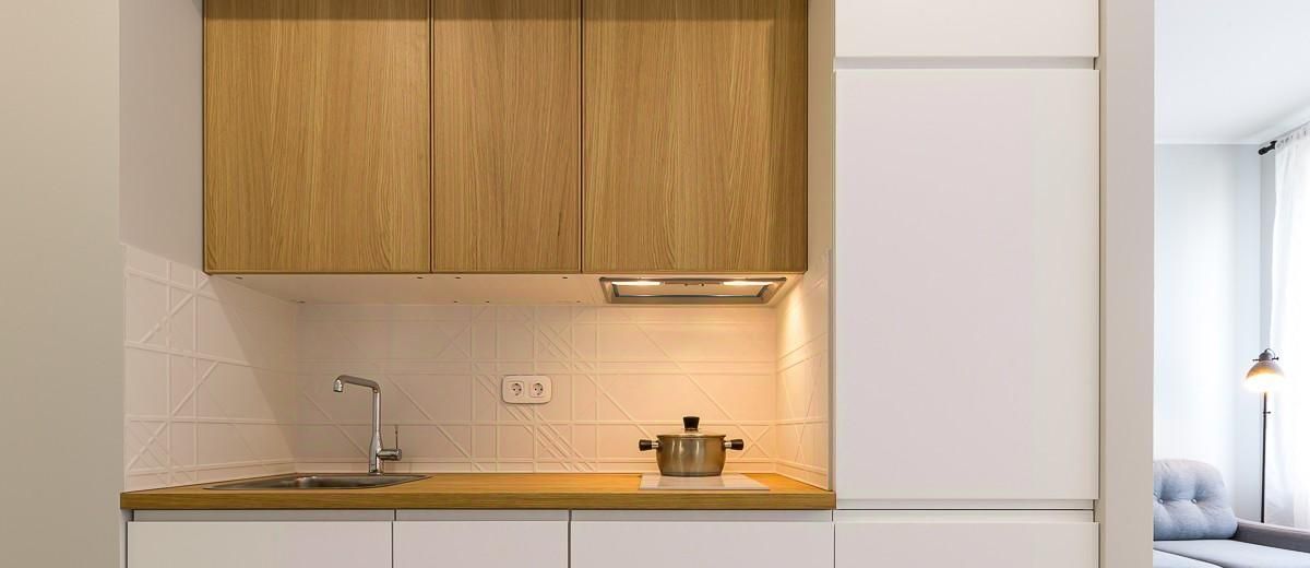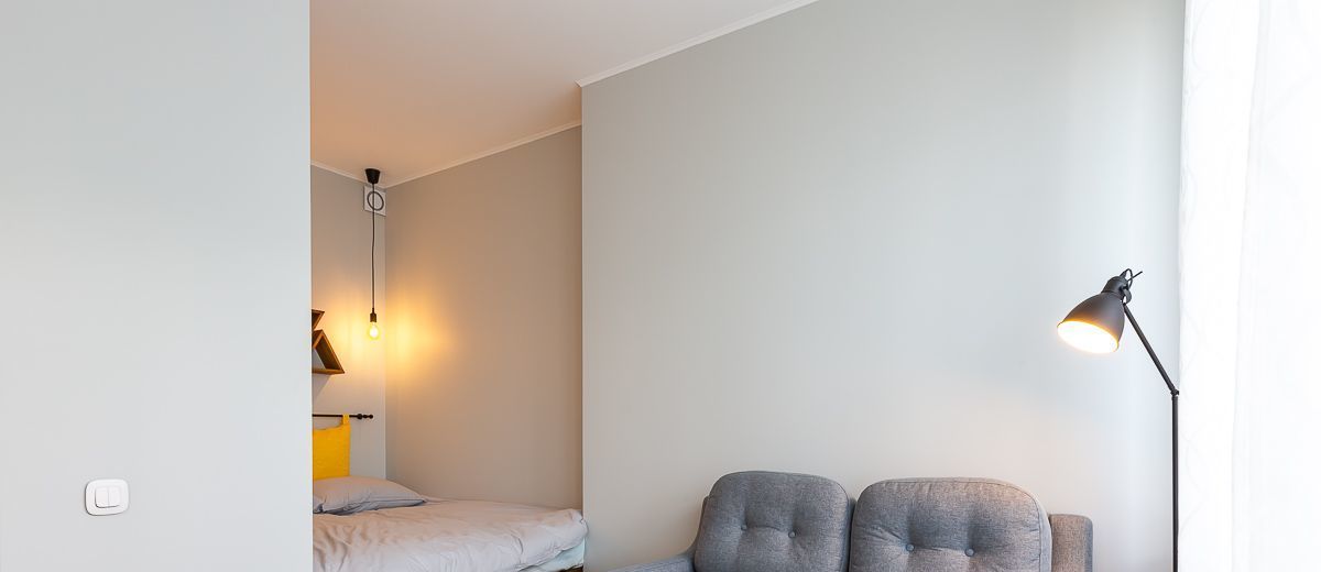 Площадь студии 28 м2. Она полностью оборудована для проживания на любой срок. Спальное место размером 160х200 см, отделено от кухни и уютно расположено.