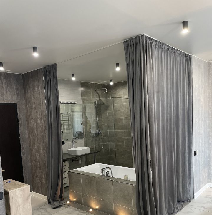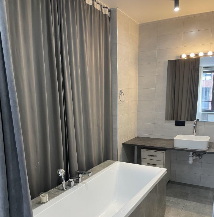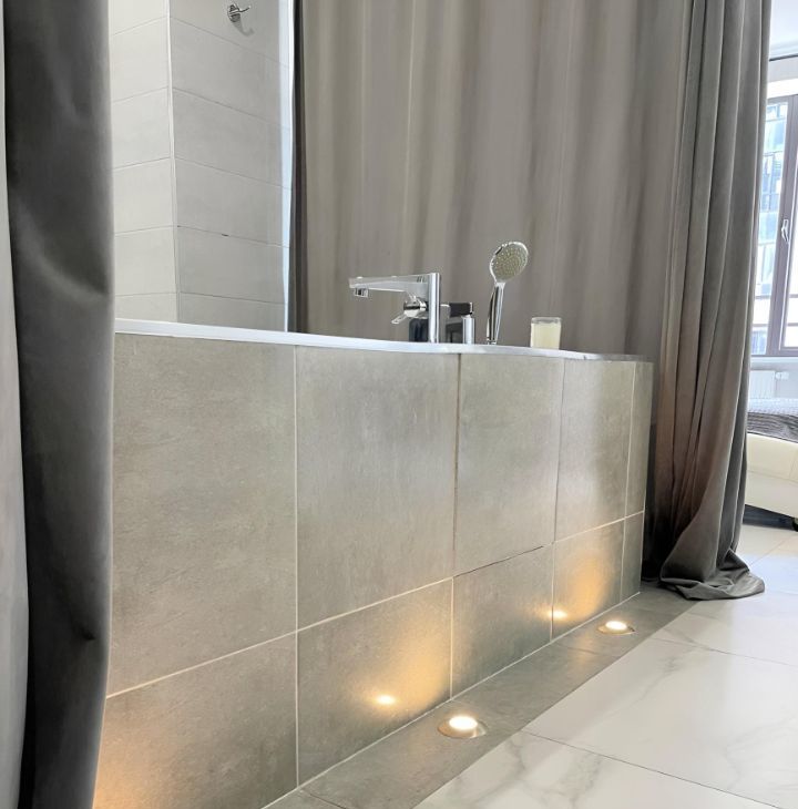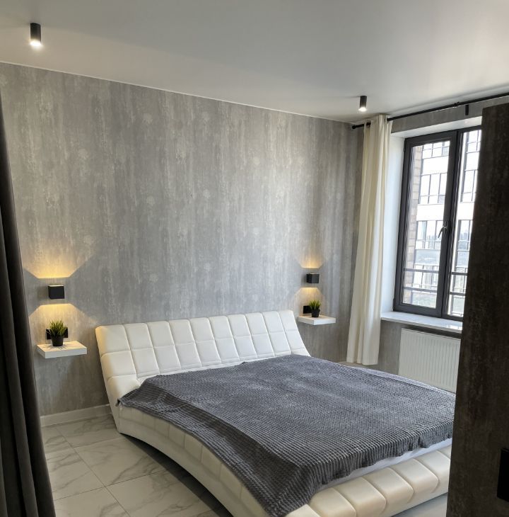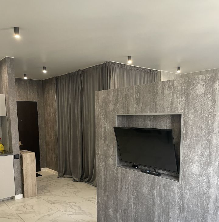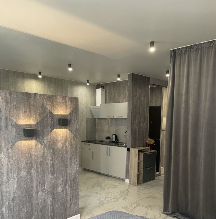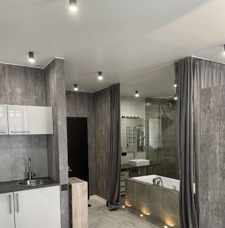 В квартире комфортная двуспальная кровать, фоновая подсветка, телевизор, главной особенностью является ванна, расположенная на одной площади с жилой частью студии, есть гардеробная комната, тёплый пол.