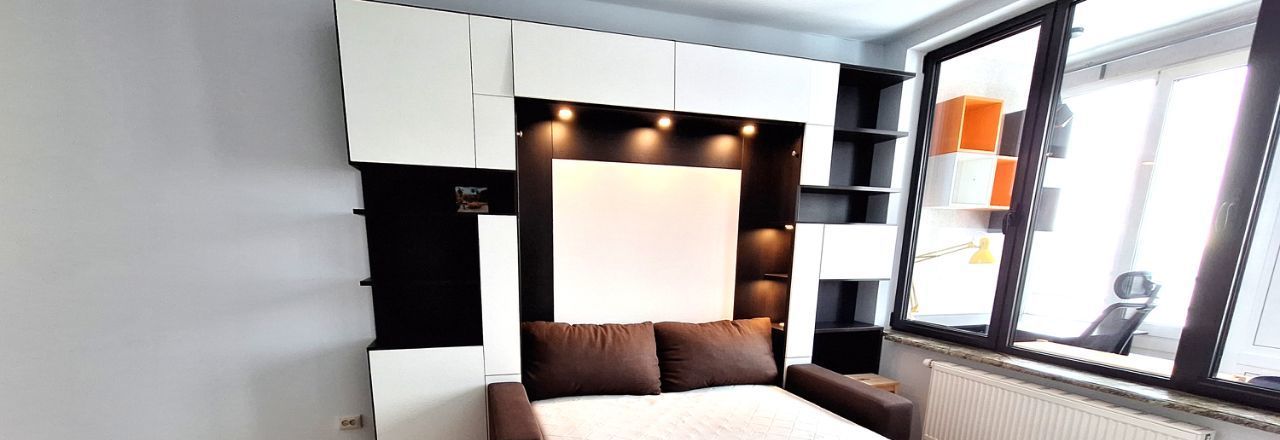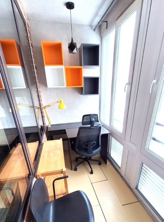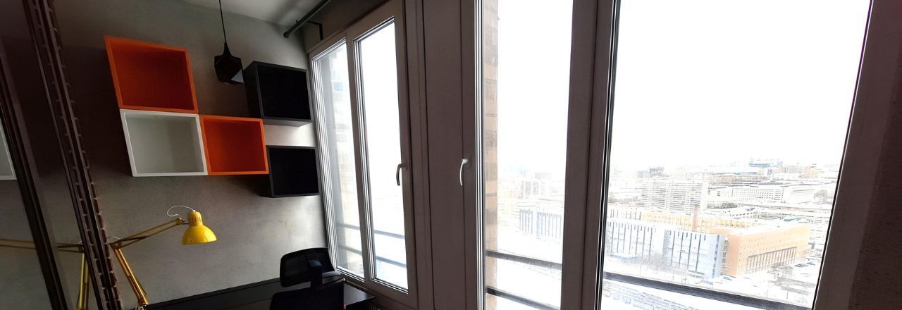 Общая площадь квартиры составляет 36 кв. м, т.к. есть тёплая лоджия, где уже оборудовано рабочее место с видом на Москва-Сити. Высокие потолки (3 метра) и большие окна, выходящие на улицу и во двор, делают пространство еще более просторным и светлым.