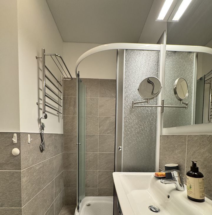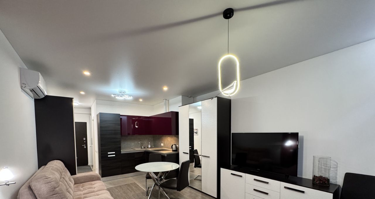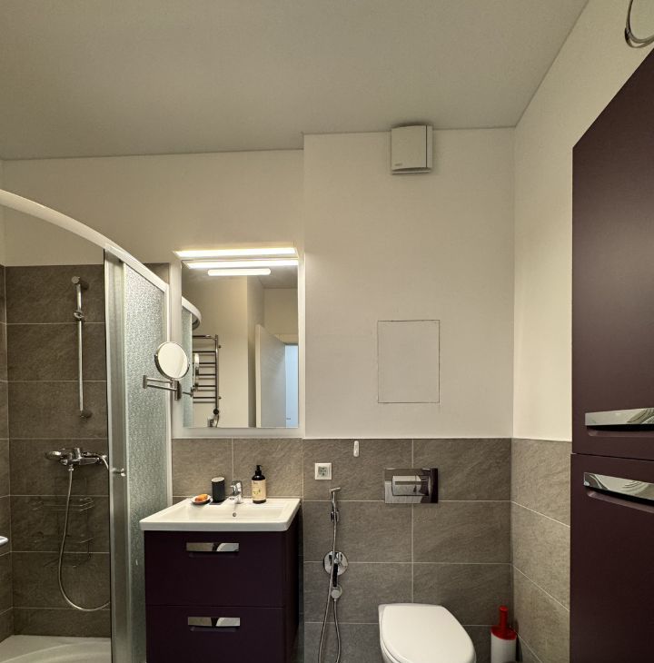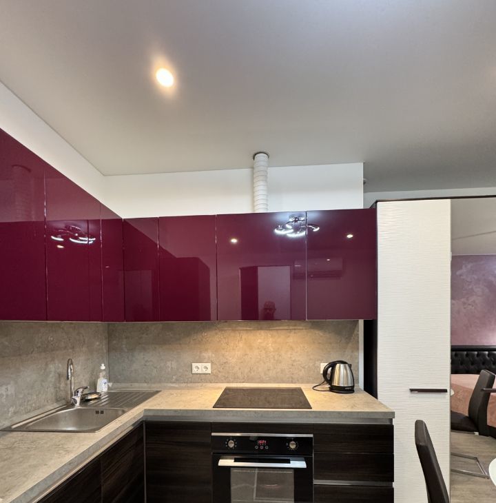 В квартире сделан качественный, свежий ремонт, имеется вся необходимая мебель и бытовая техника от ведущих европейских производителей: итальянский кухонный гарнитур Lungomare, немецкая бытовая техника, посудомоечная машина, стиральная машина с функцией сушки, кондиционер, просторная лоджия, на окнах установлены рулонные шторы Blackout, много места для хранения личных вещей.
