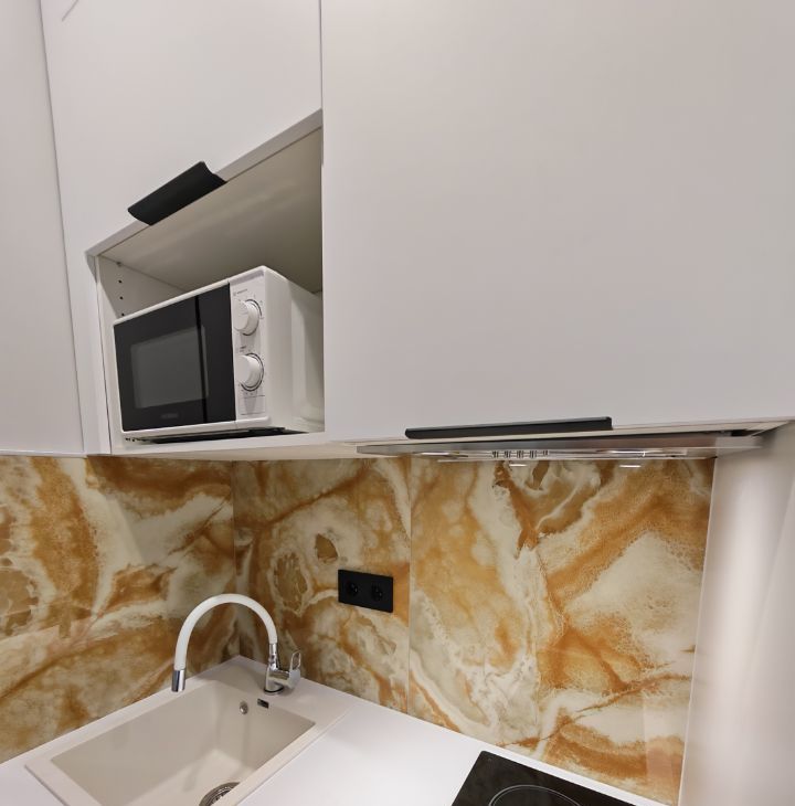 Современная техника и мебель: удобная кровать с ортопедическим матрасом, встроенная кухня с индукционной плитой и микроволновой печью, телевизор с доступом к Wi-Fi, стиральная машина, холодильник, кондиционер.