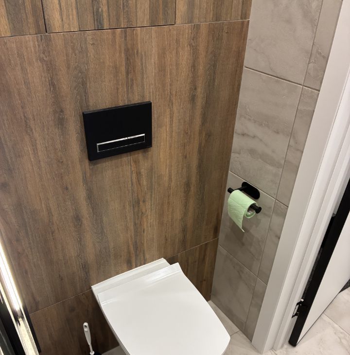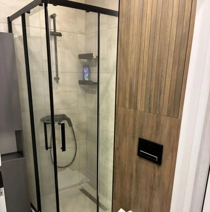 Ванная комната оснащена душевой кабиной и стиральной машиной. В прихожей предусмотрены вместительные шкафы для одежды.