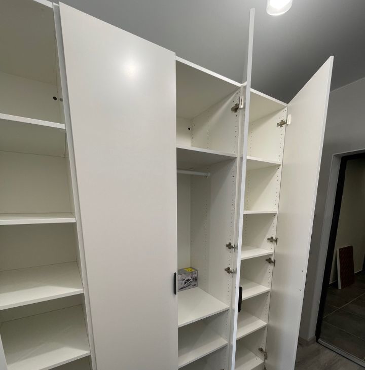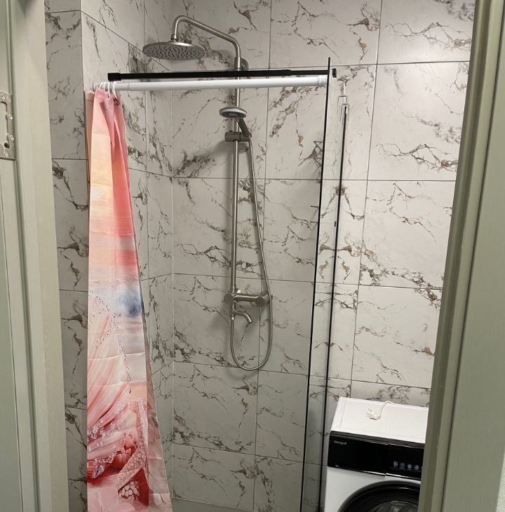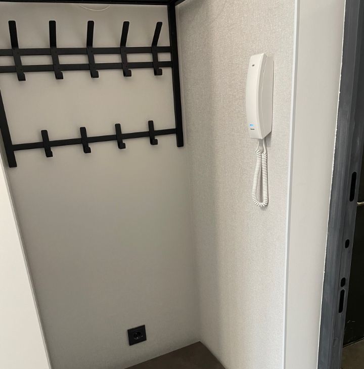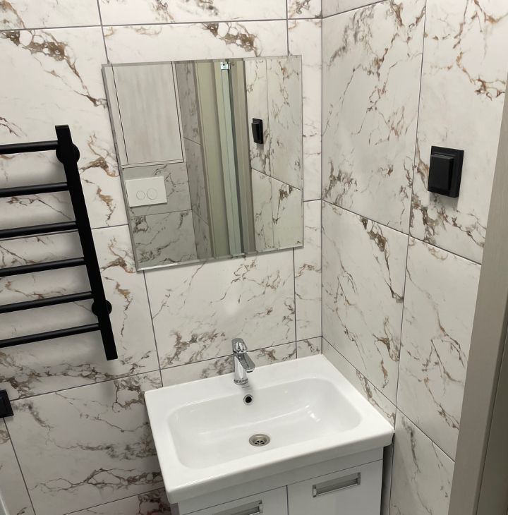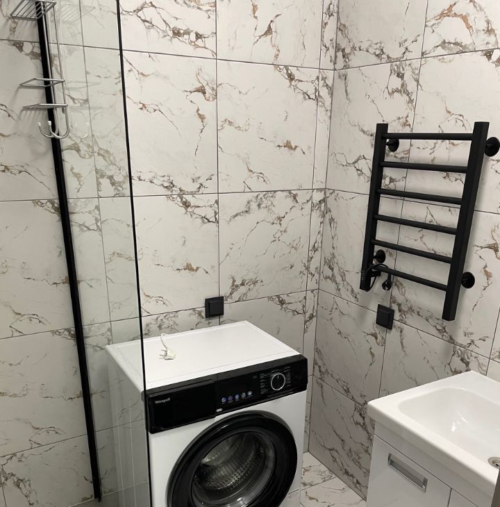На фото еще нет, но все это будет к 27 апреля: Телевизор 55 дюймов, тумбочка прикроватная, шкаф-пенал в ванной, крючки для полотенец.