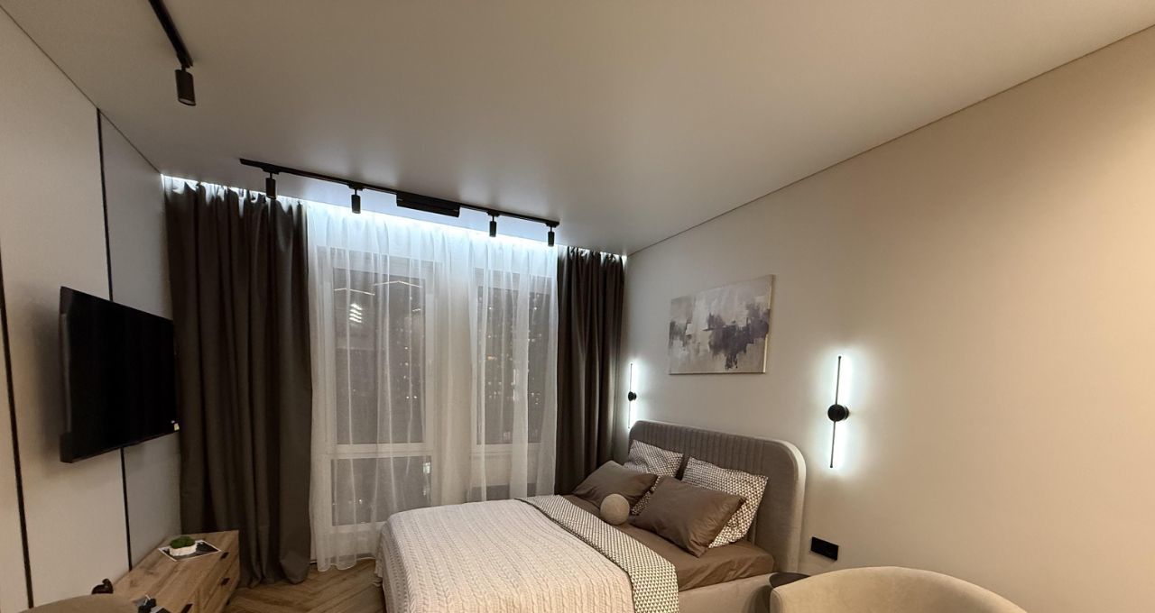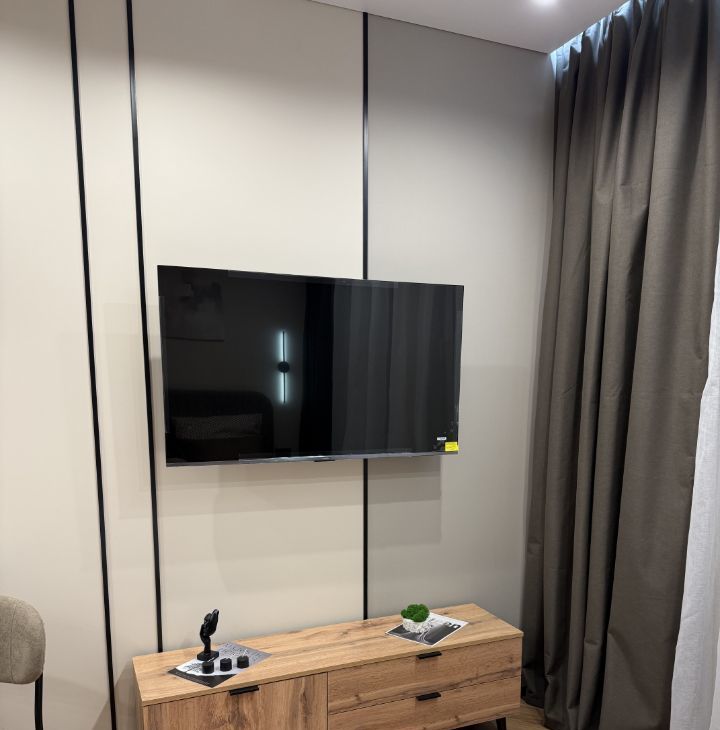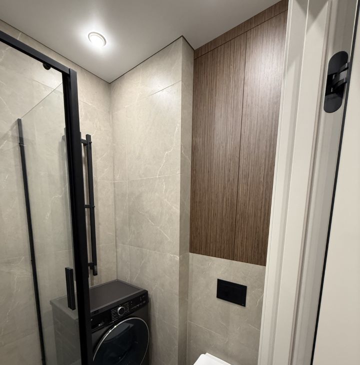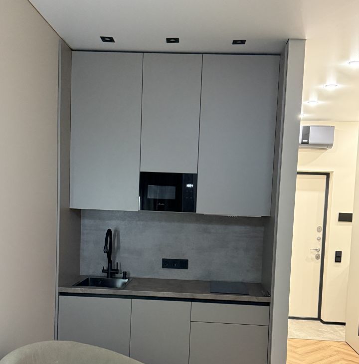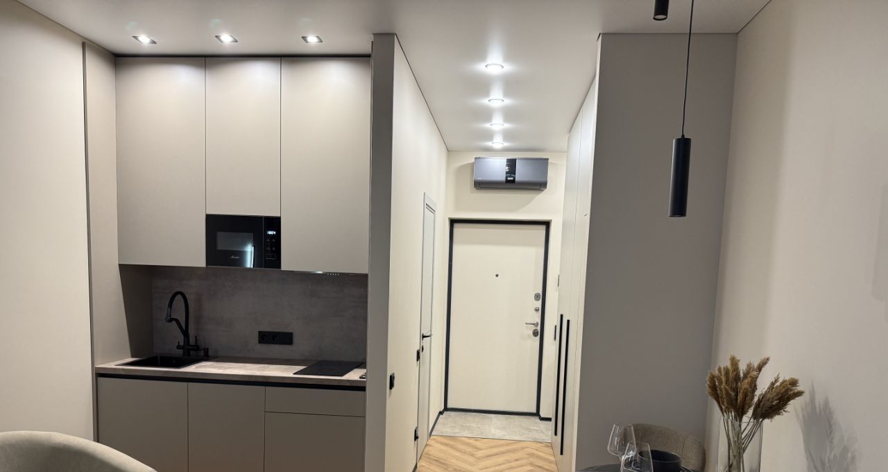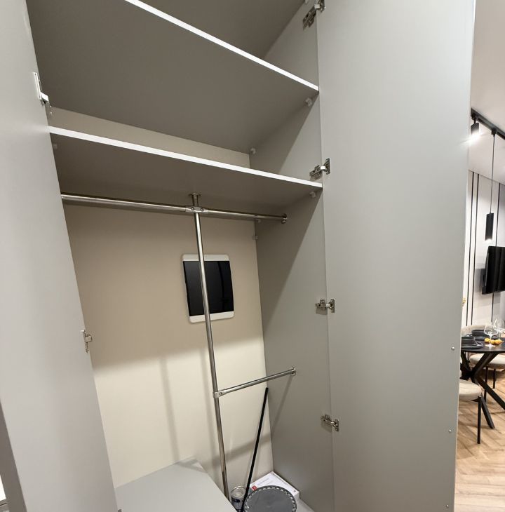 Кондиционер, телевизор с android tv, встроенные: холодильник с инверторным бесшумным двигателем, микроволновая печь, вытяжка; стиральная машина с функцией сушки, интернет и роутер, большая кровать с подъемным механизмом и местом для хранения.