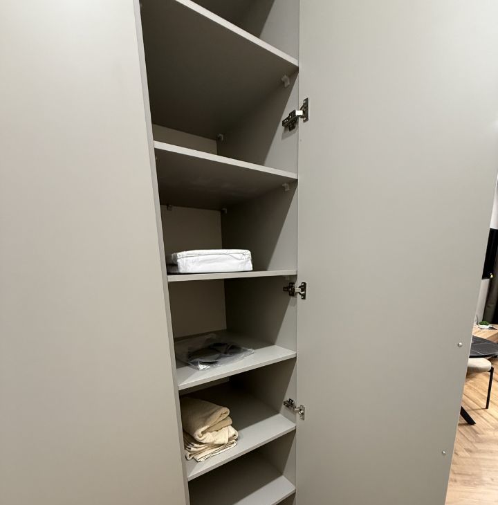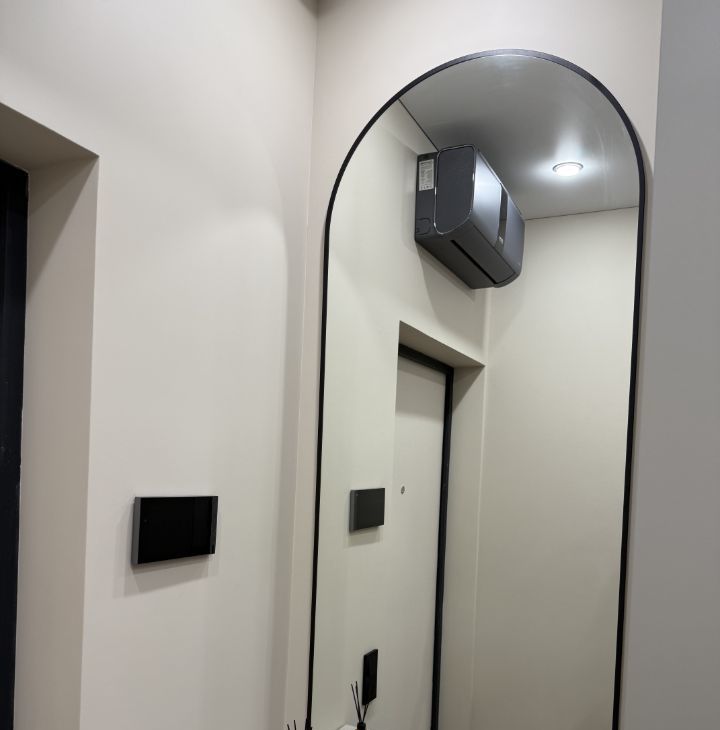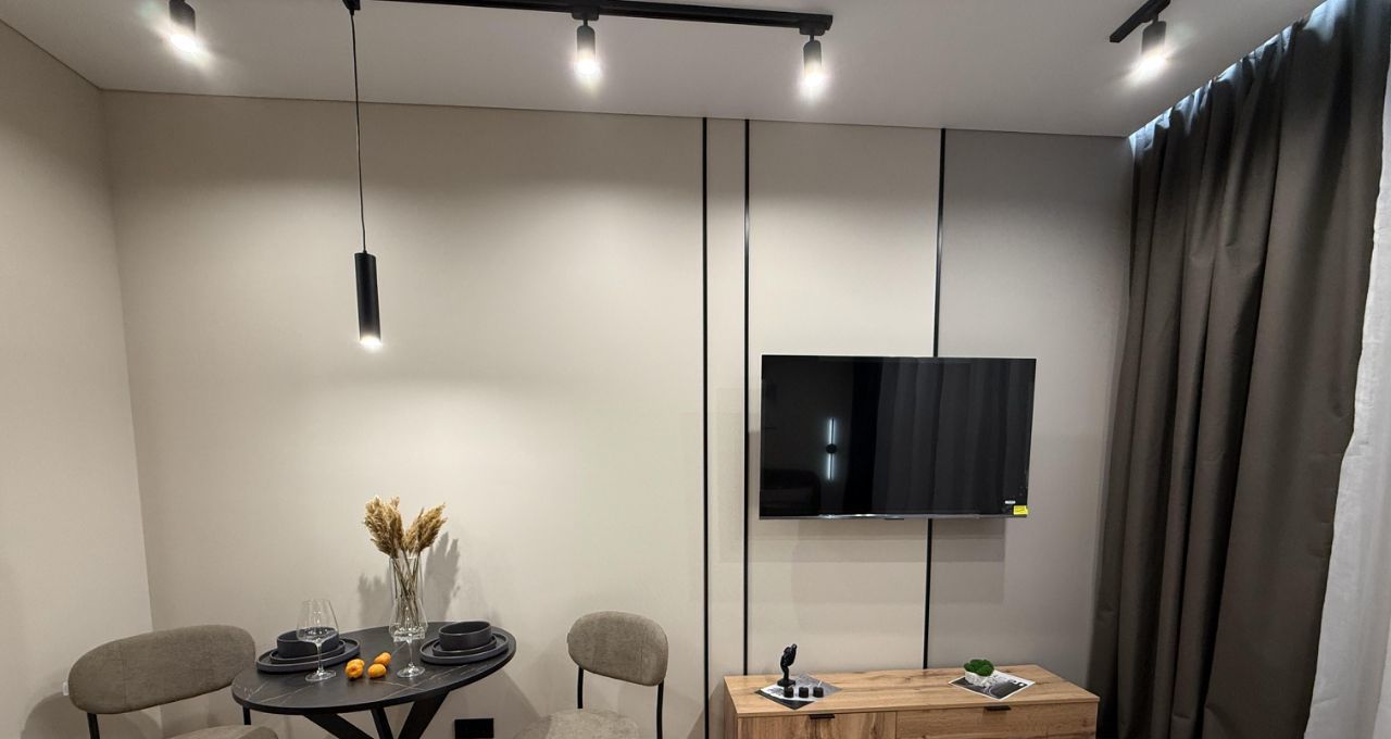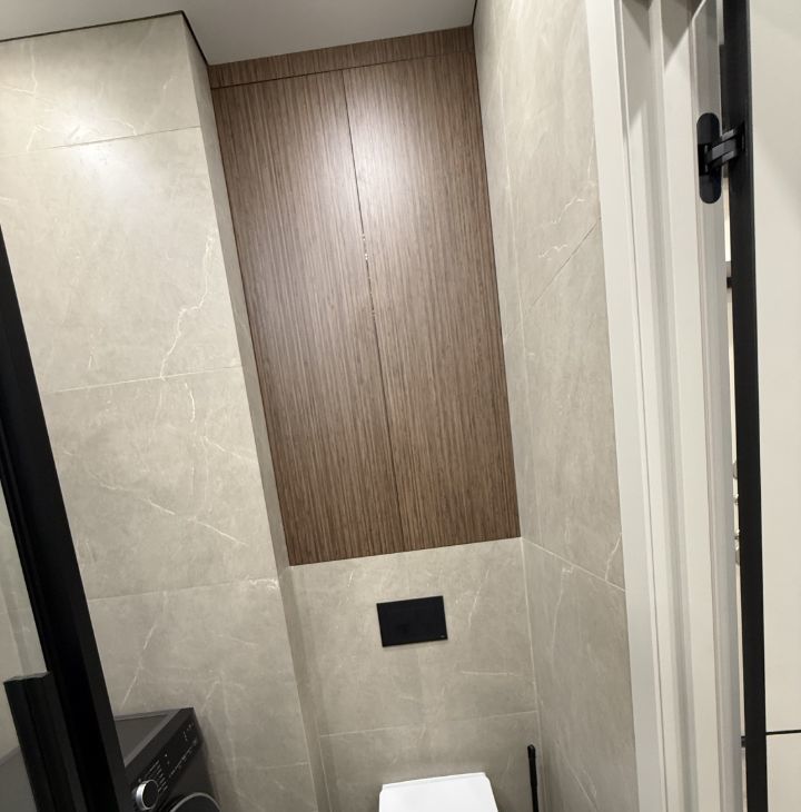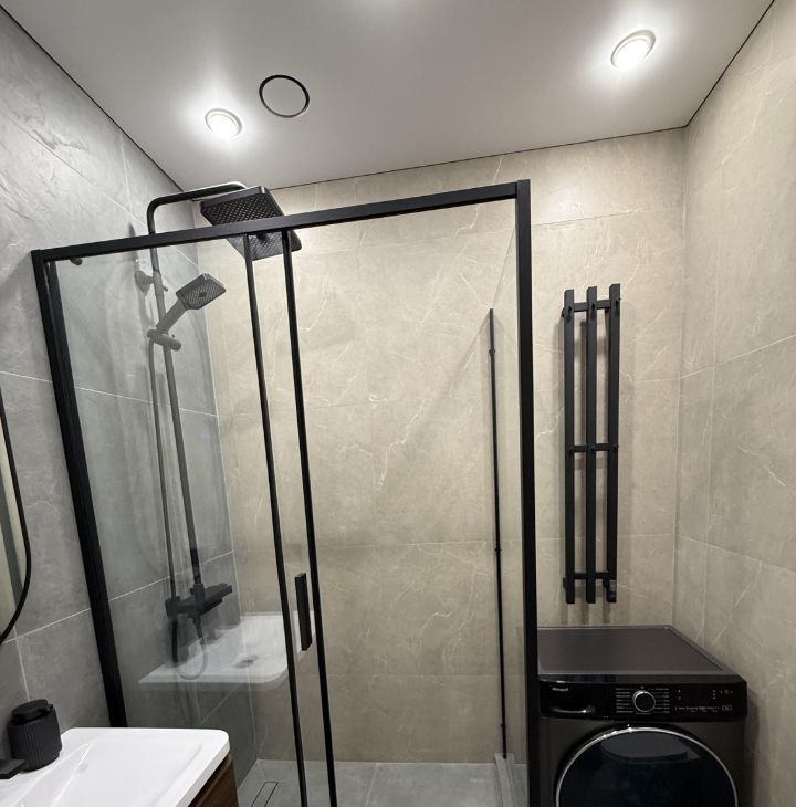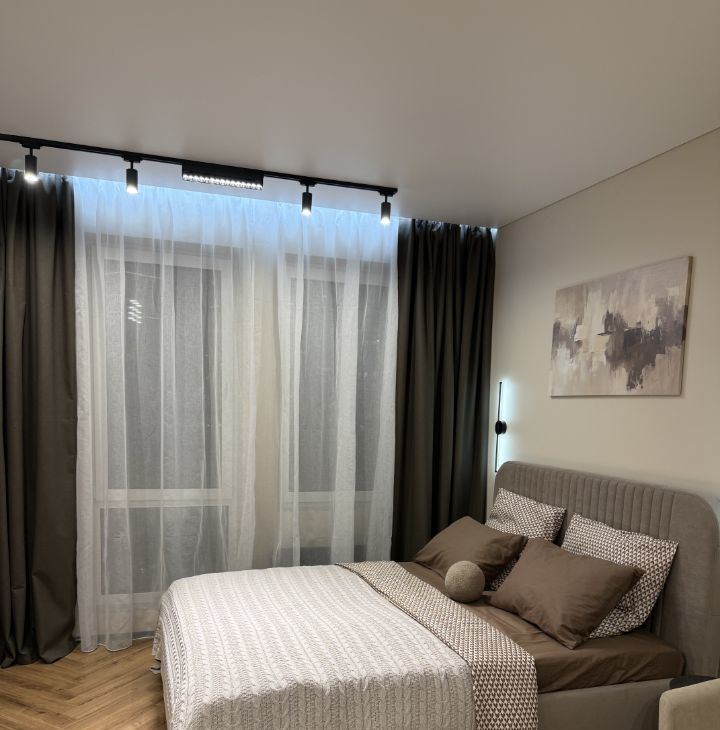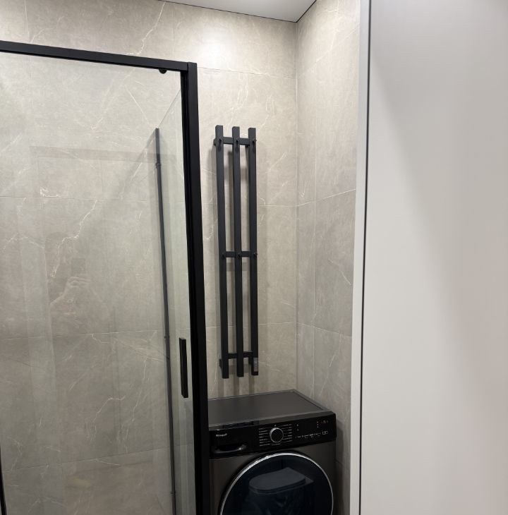 Кондиционер, телевизор с android tv, встроенные: холодильник с инверторным бесшумным двигателем, микроволновая печь, вытяжка; стиральная машина с функцией сушки, интернет и роутер, большая кровать с подъемным механизмом и местом для хранения.