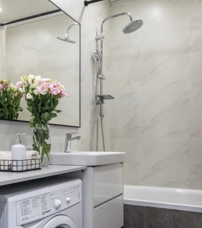 Быт: Стиральная машина со встроенной функцией сушки белья в ванной.