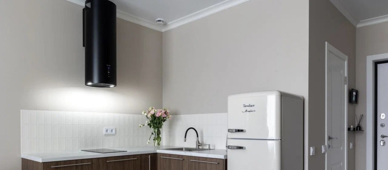 Кухня: на заказ от известной компании и на гарантии. Встроенная техника: духовка, СВЧ, посудомоечная машина, вытяжка, варочная панель. Дизайнерский холодильник добавляет стиля.
